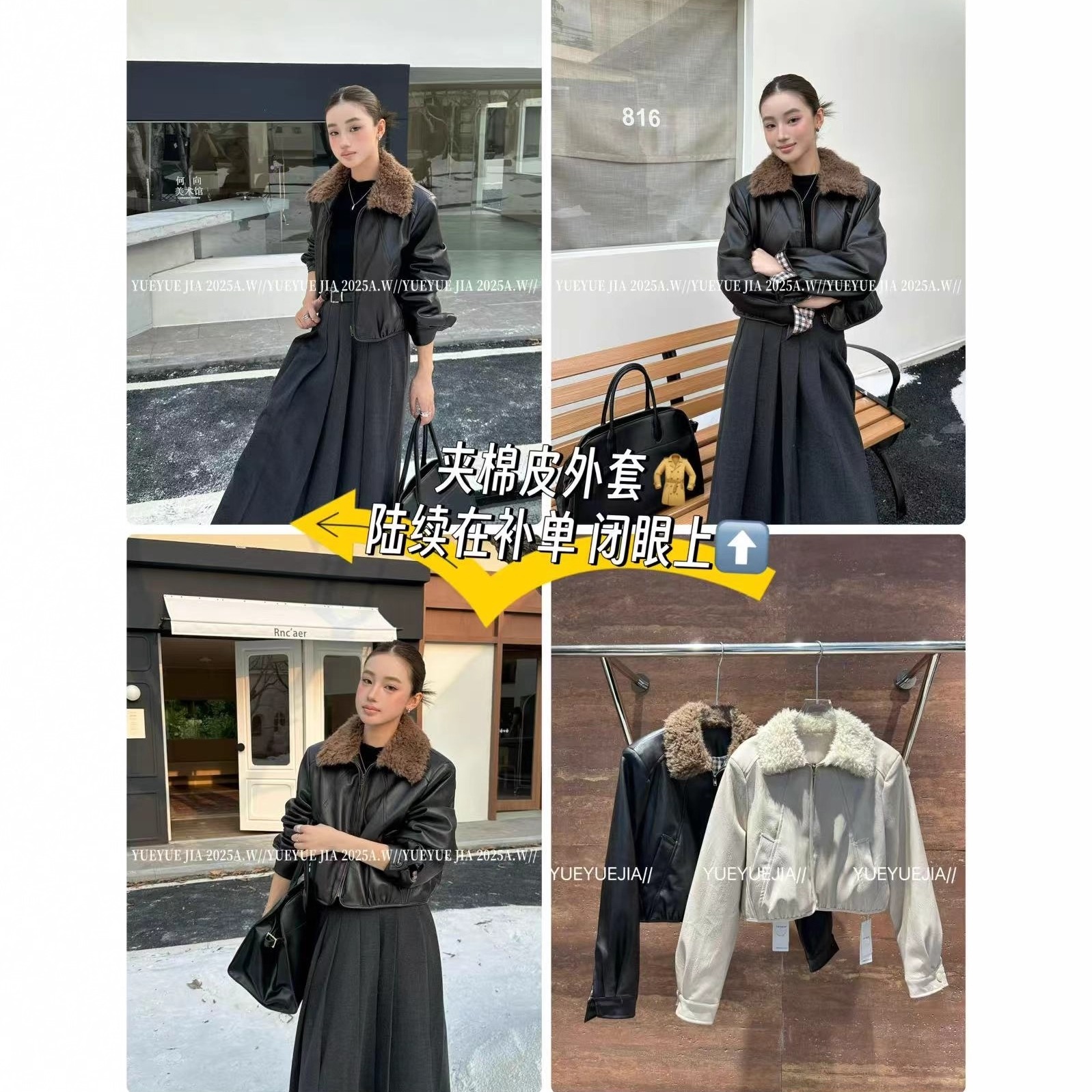 YUEYUE韩版时尚宽松休闲百搭毛毛翻领皮衣外套女气质机车夹克7376