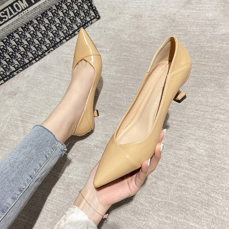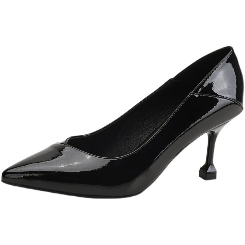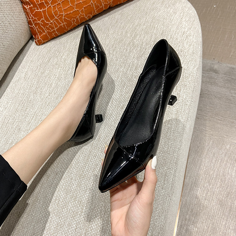 黑色职业工作高跟鞋女春季2025新款猫跟漆皮气质尖头裸色细跟单鞋