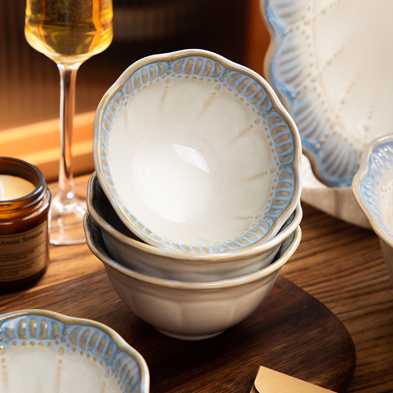 烟蓝陶瓷碗碟套装家用2024新款餐具法式浮雕米饭碗高级感轻奢碗盘