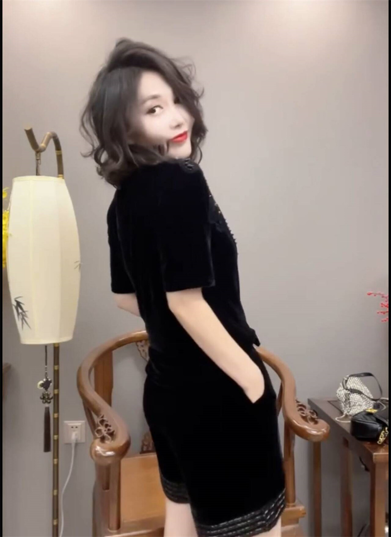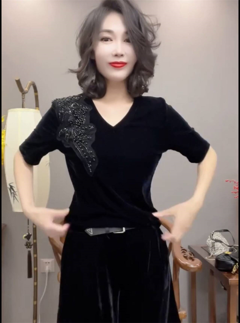 经典黑色丝绒衬衫女2024新款短袖V领T恤小衫百搭钉珠打底衫上衣潮