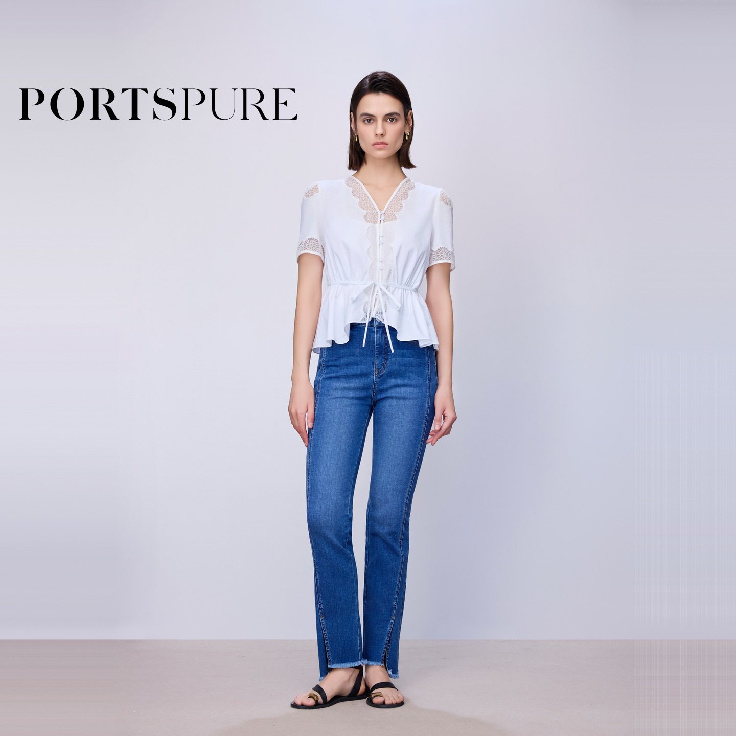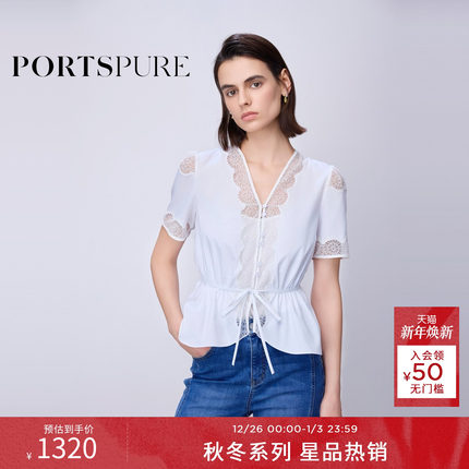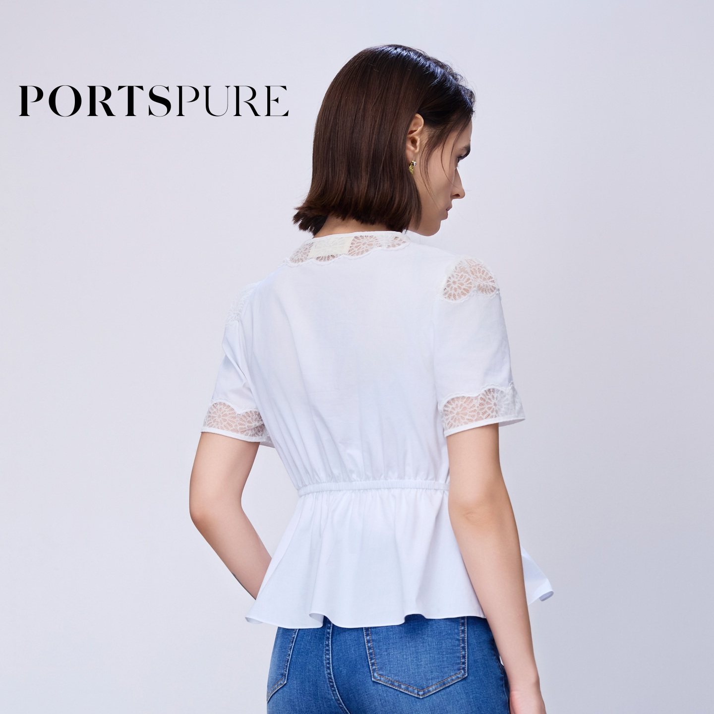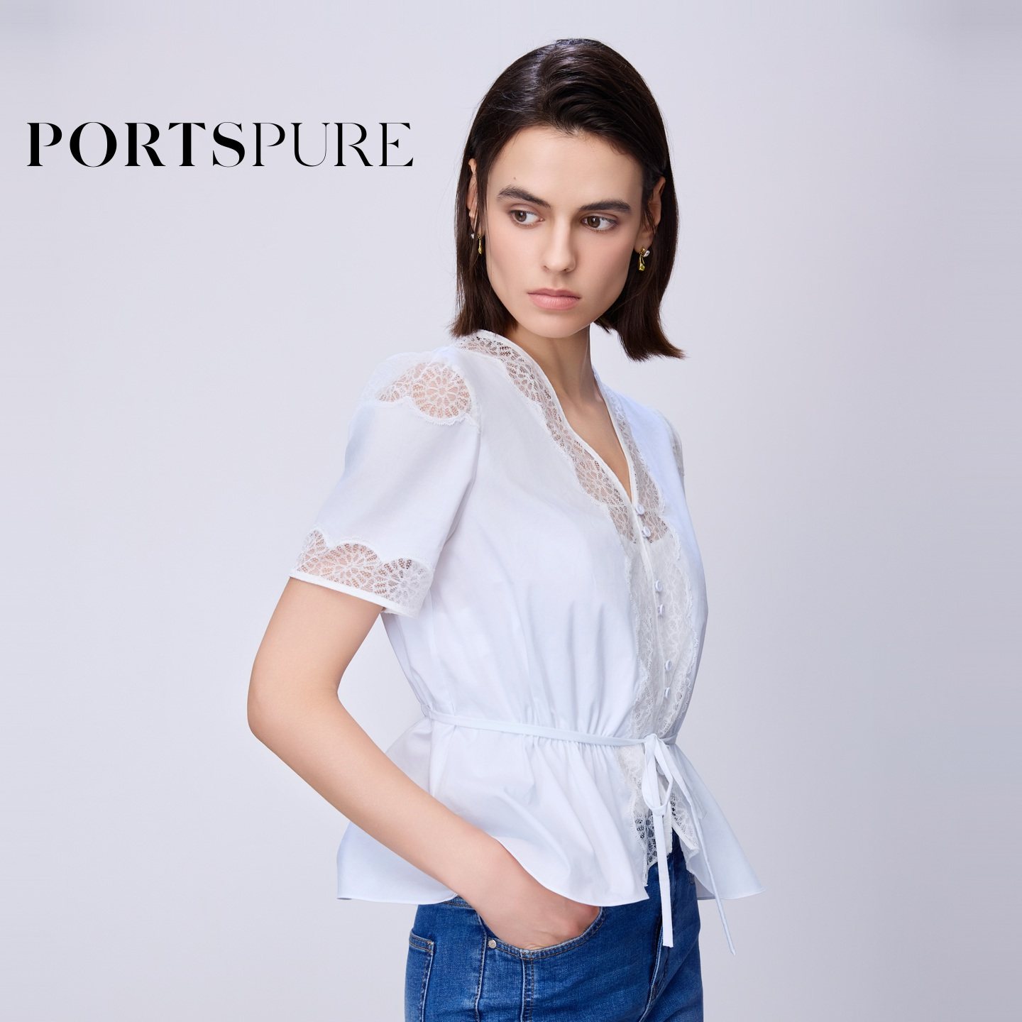 商场同款 宝姿PORTSPURE女装2025秋冬新品经典度假蕾丝短袖衬衫