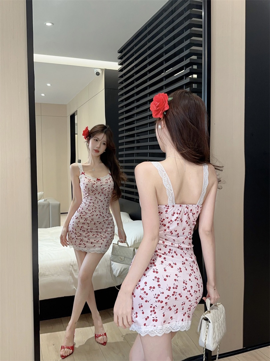 碎花蕾丝辣妹纯欲风性感吊带连衣裙女带胸垫修身显瘦收腰包臀短裙