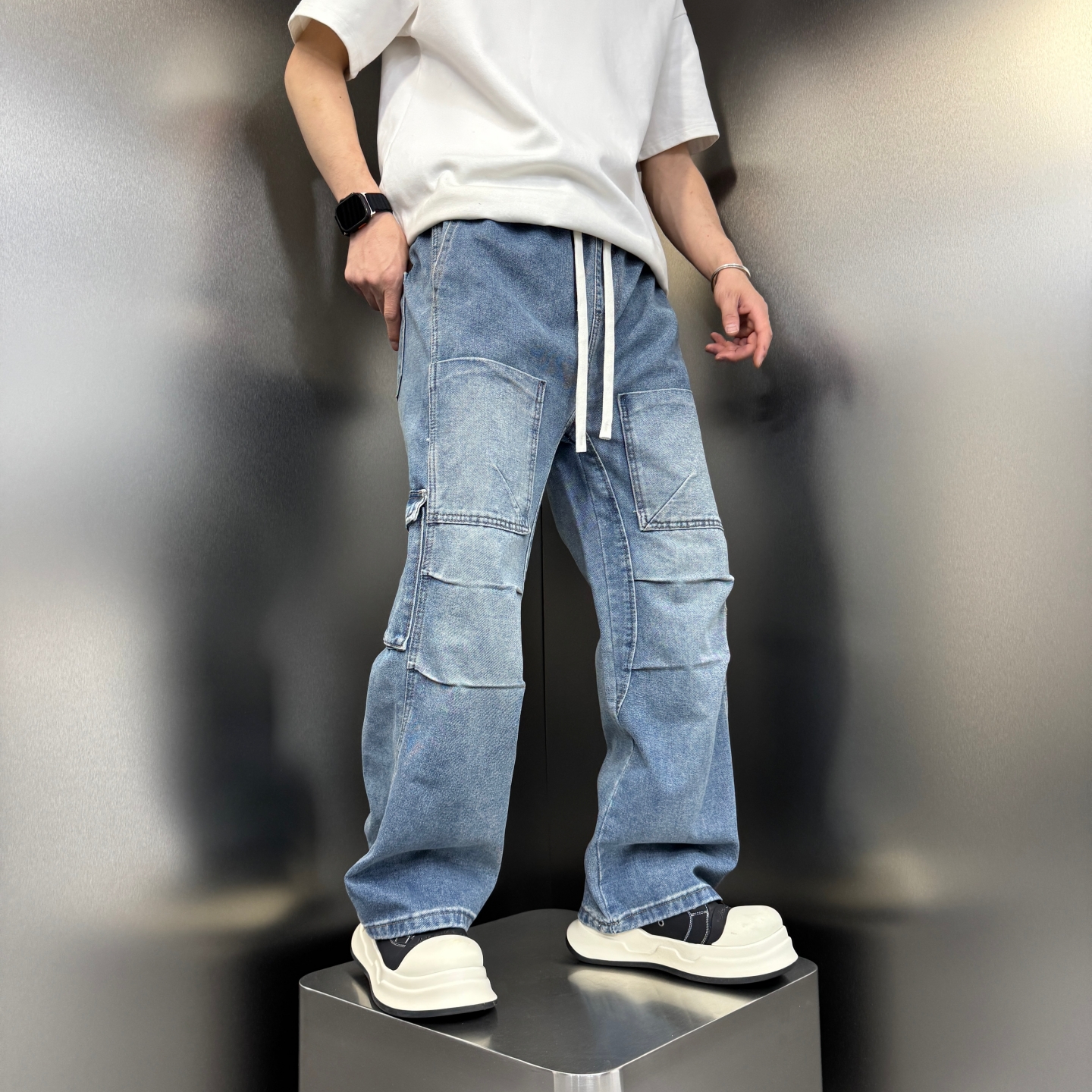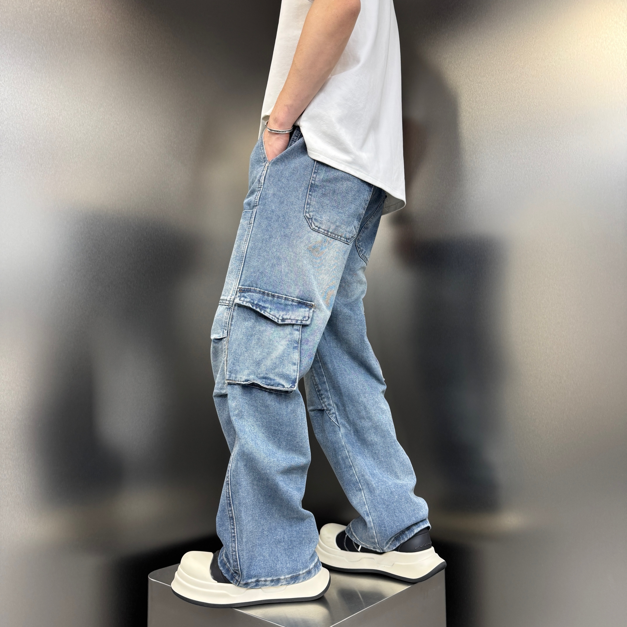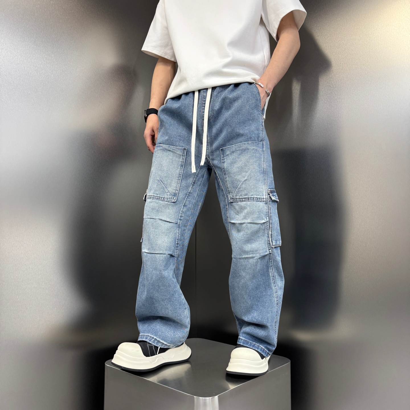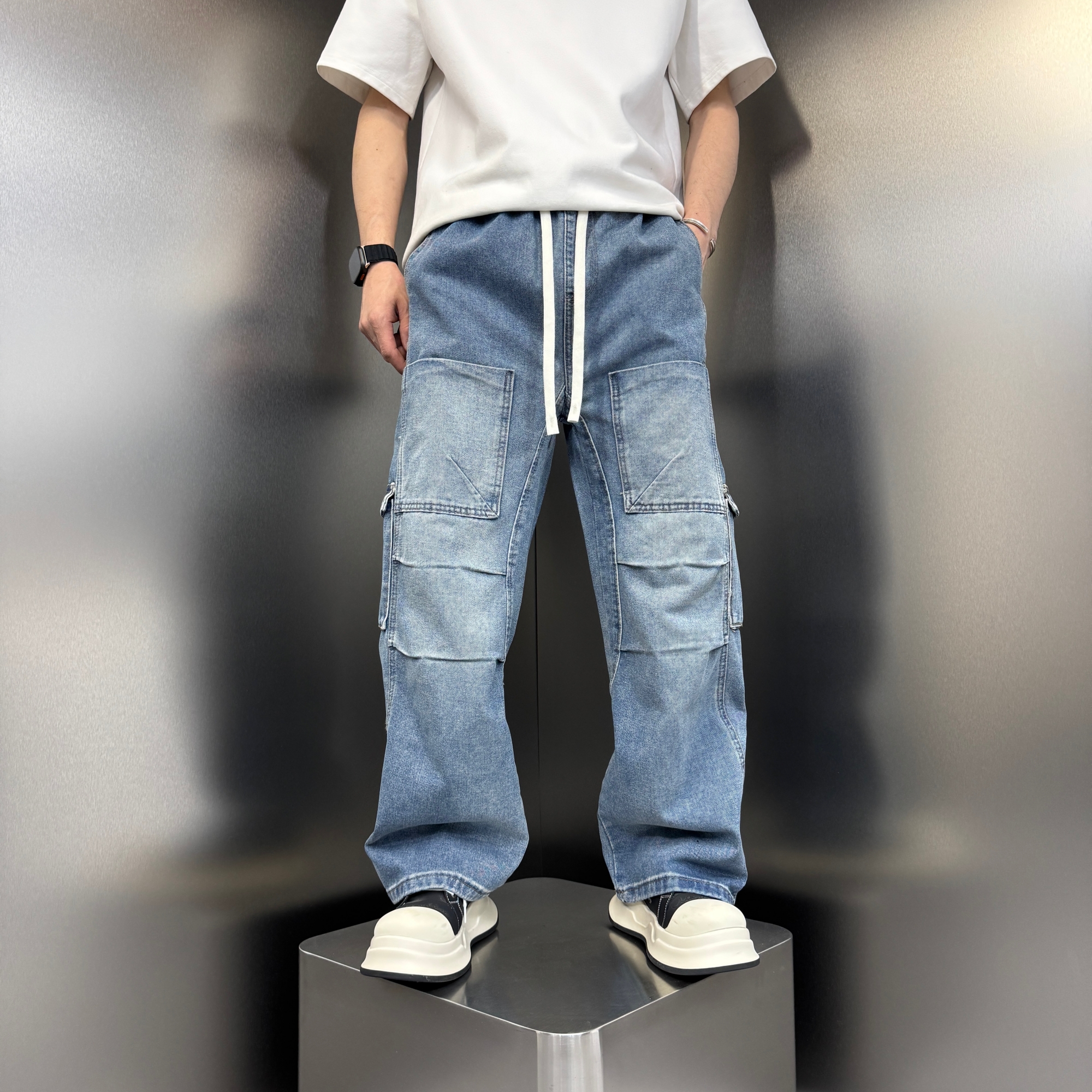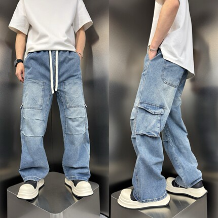 夏季新款美式拼接多口袋工装牛仔裤男士痞帅老爹裤宽松直筒长裤子