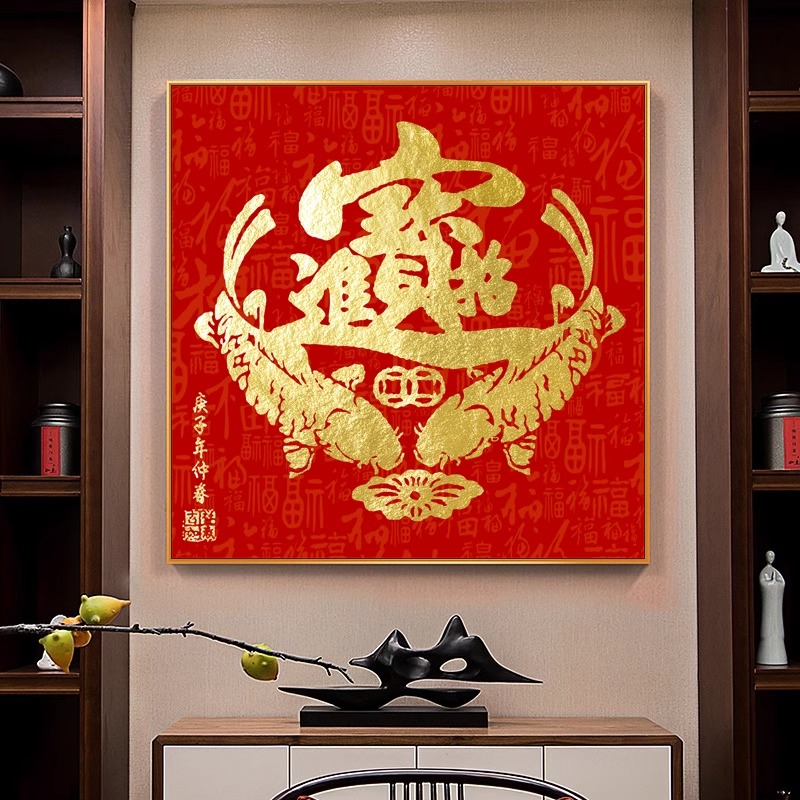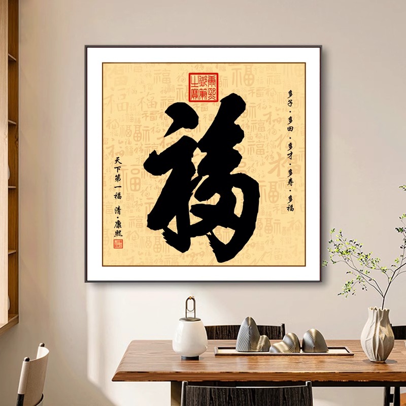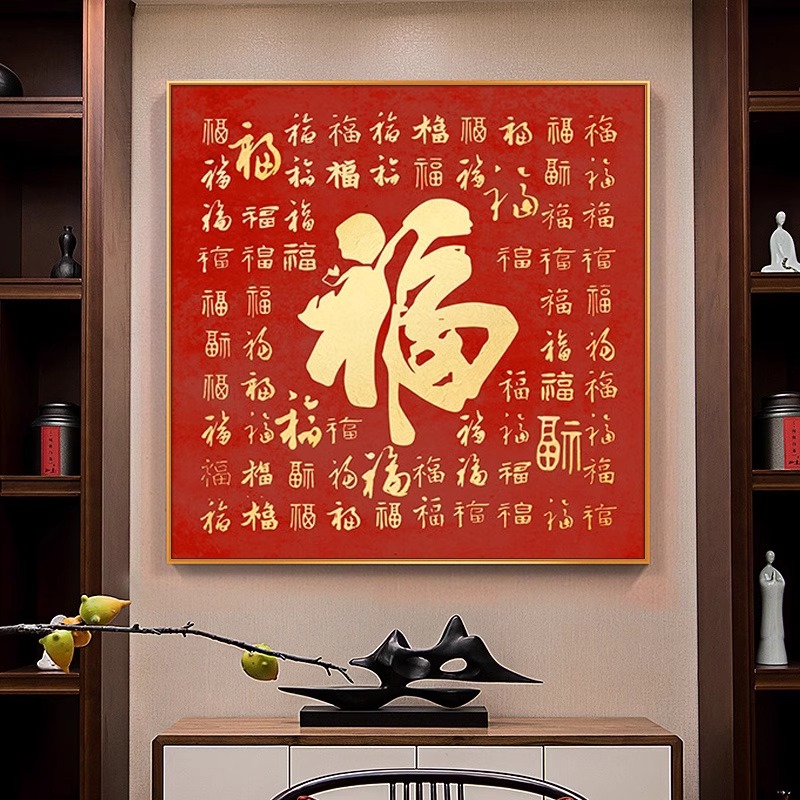 中国红福字装饰画新中式客厅入户玄关挂画茶室办公室寓意方形壁画