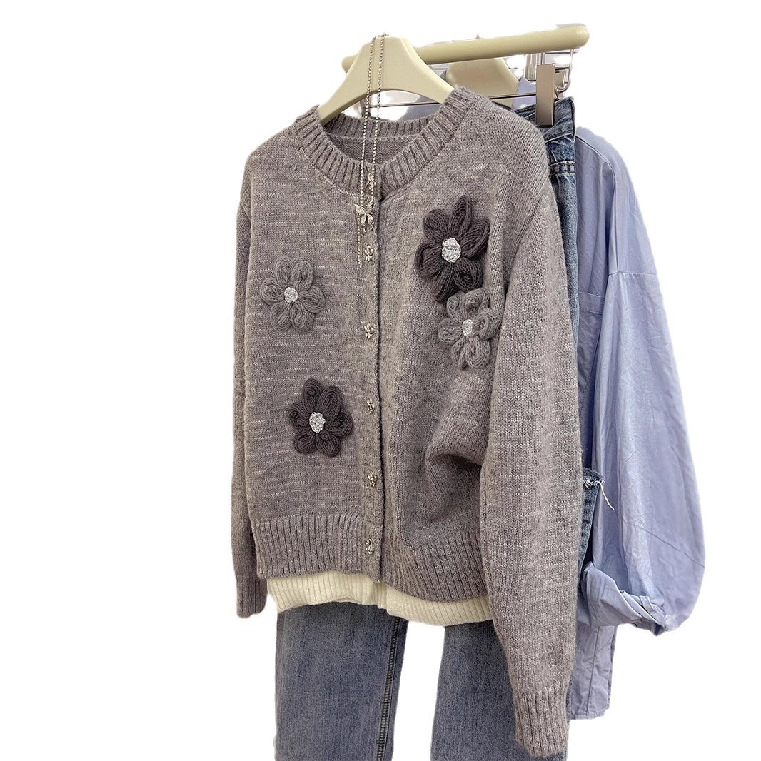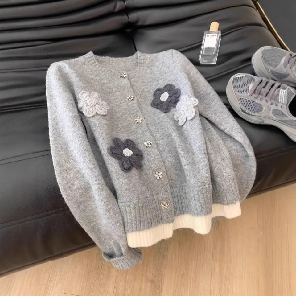 灰色手工花朵针织开衫女2025秋冬新款软糯小个子别致短款毛衣外套