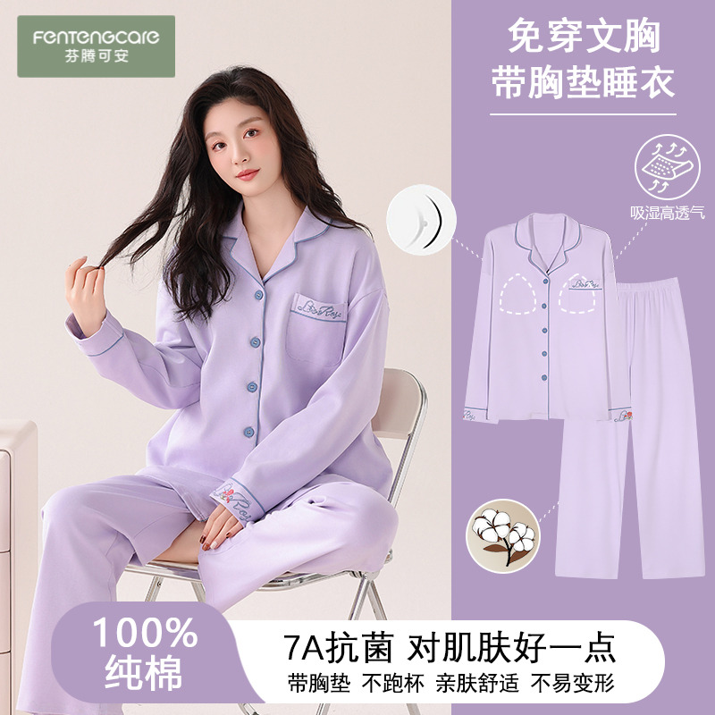 芬腾可安睡衣女款2025新款长袖春秋季纯棉带胸垫大码家居服女套装