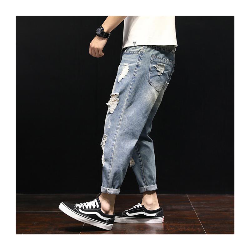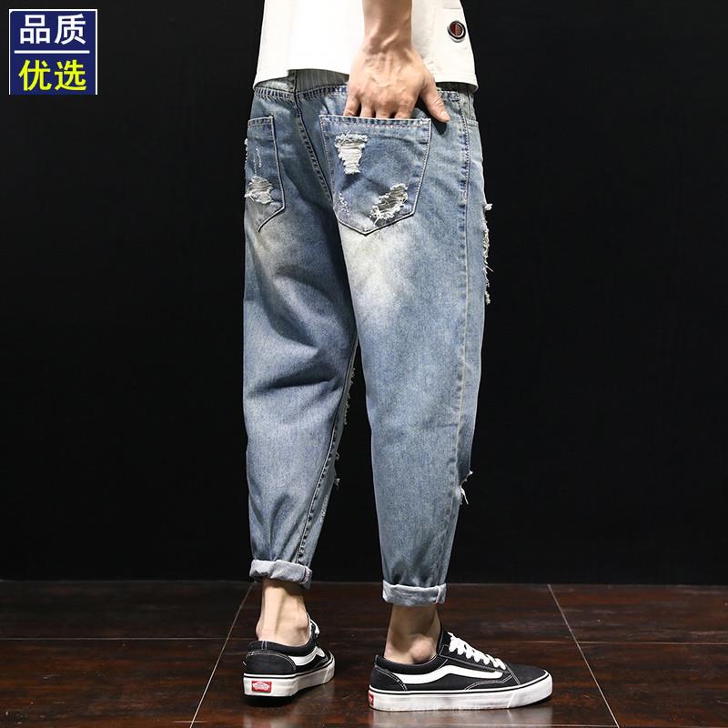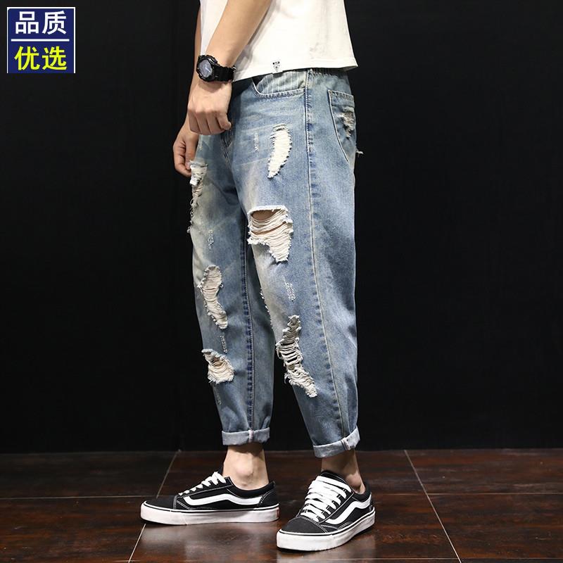 破洞九分牛仔裤男潮牌宽松大码韩版潮流嘻哈乞丐哈伦小脚春季薄款