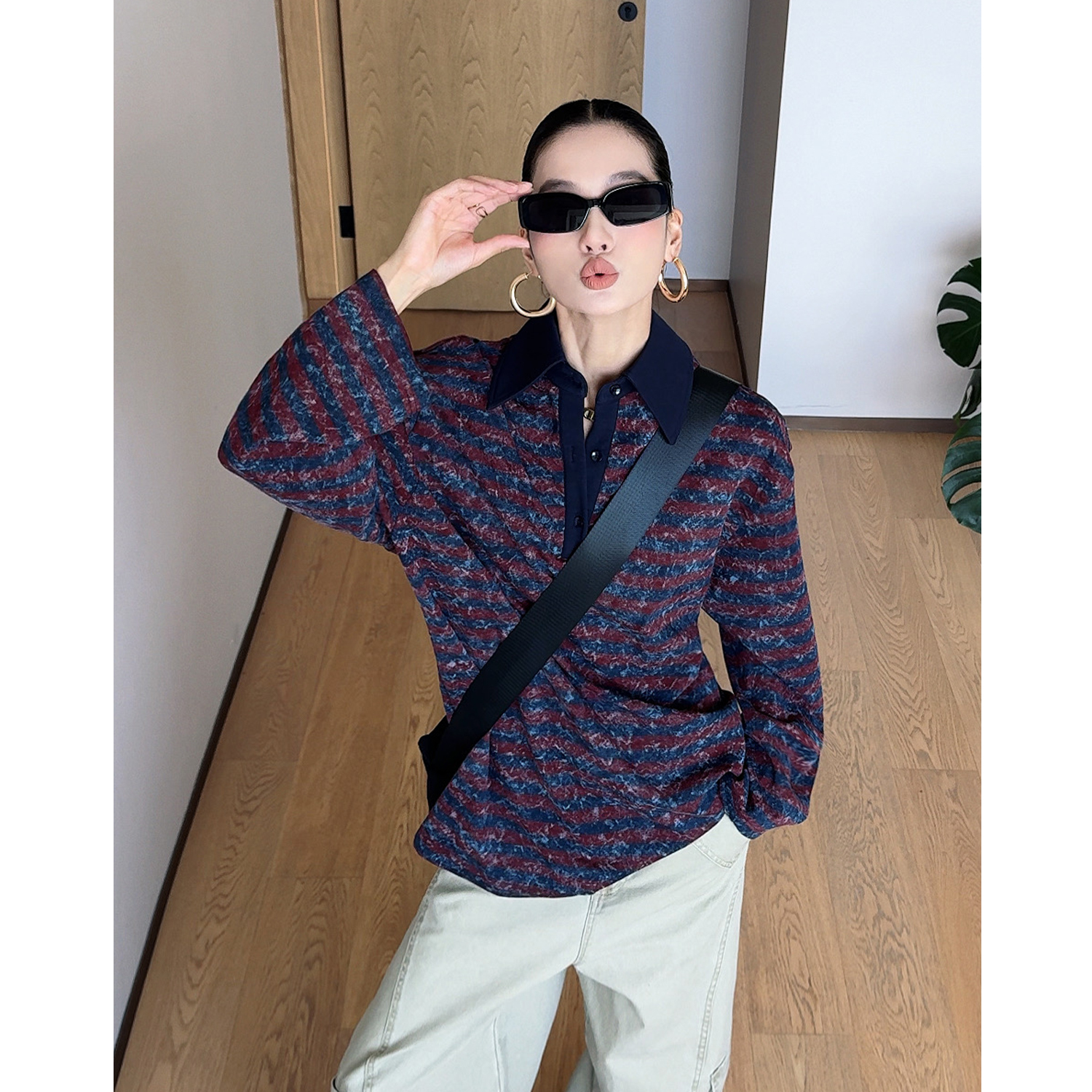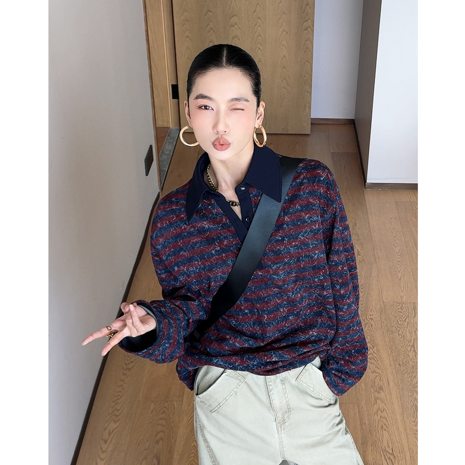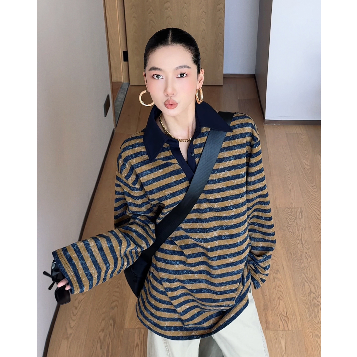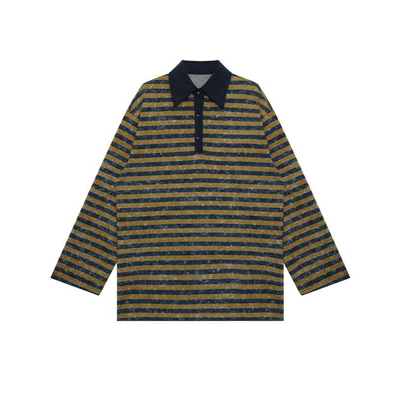 CIZZLEMORE【自由新风】撞色条纹POLO领长袖卫衣宽松中长款上衣