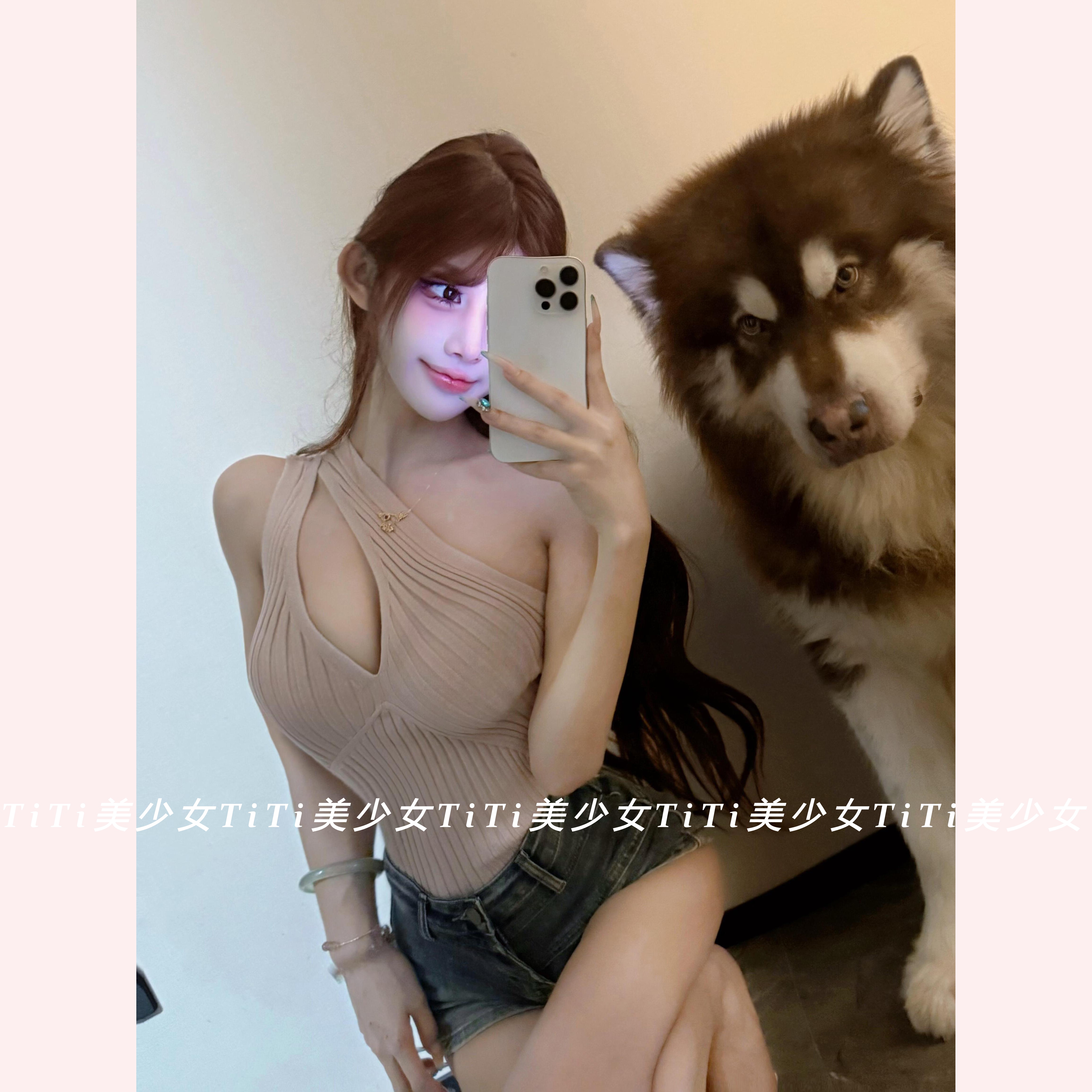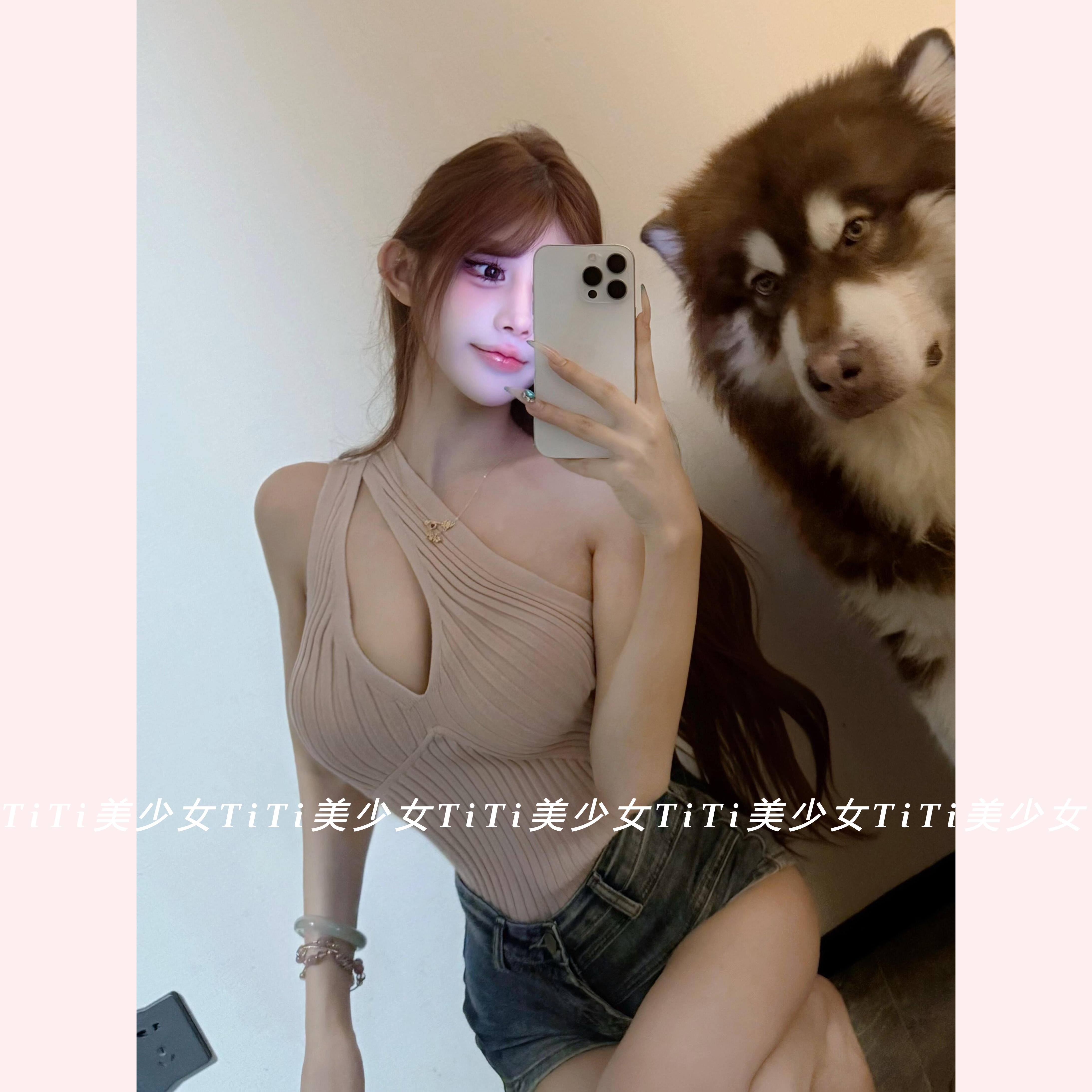 【TiTi美少女】纯欲风粉色斜肩针织吊带背心女夏无袖外穿短款上衣