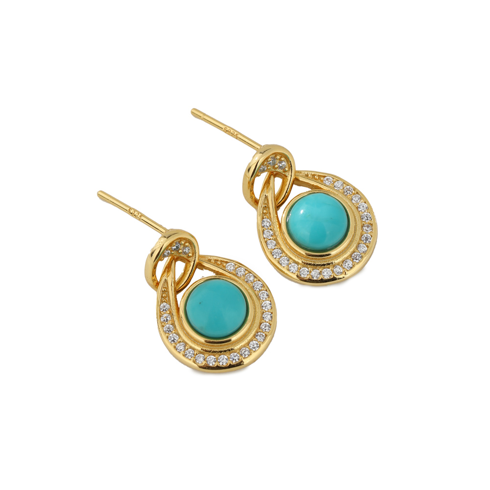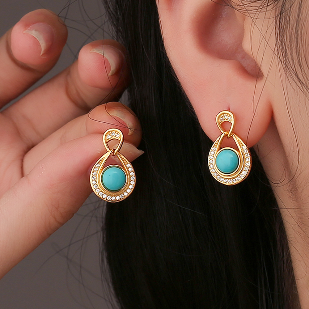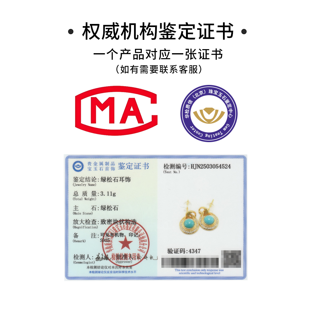 龙丰绿松轩S925银镀18k金正品天然绿松石圆珠耳钉女款高级感耳饰