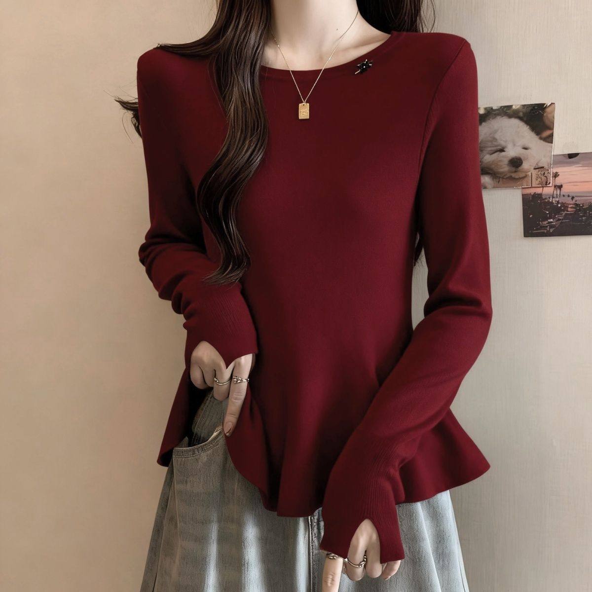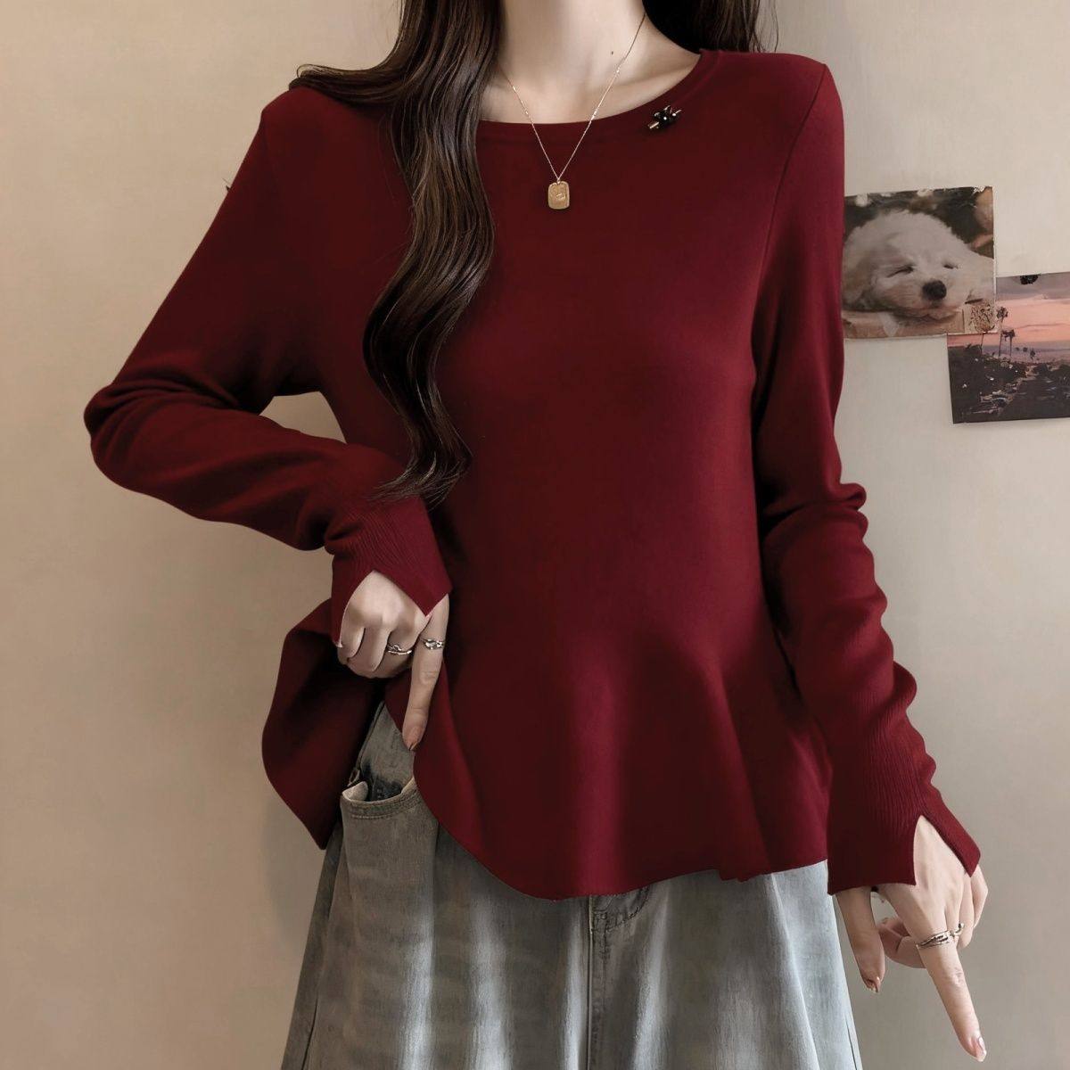 圆领荷叶长袖511325-6T恤磨毛高级气质显瘦保暖宽松上衣