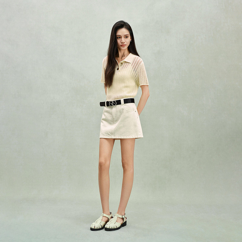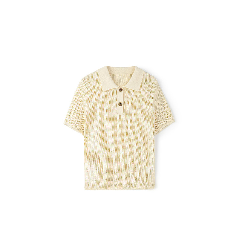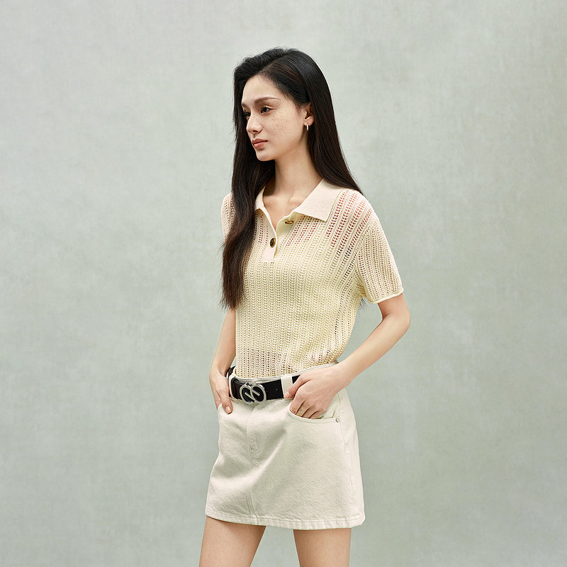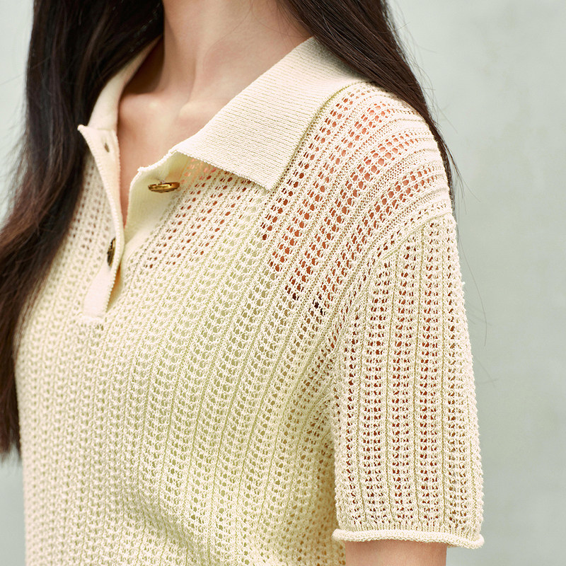 ochirly欧时力 亚麻混纺镂空polo领短袖针织衫女上衣2025春季新品