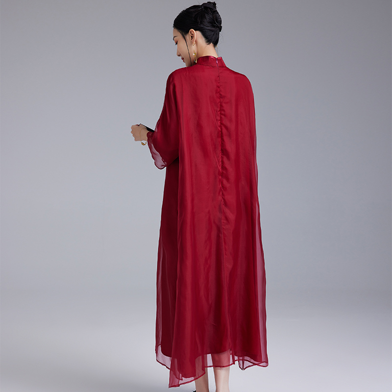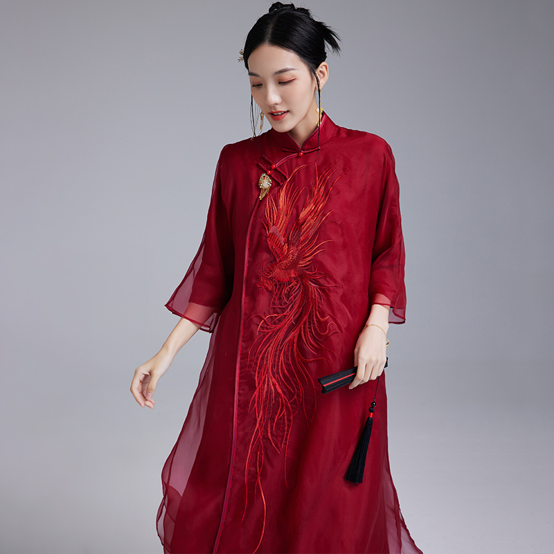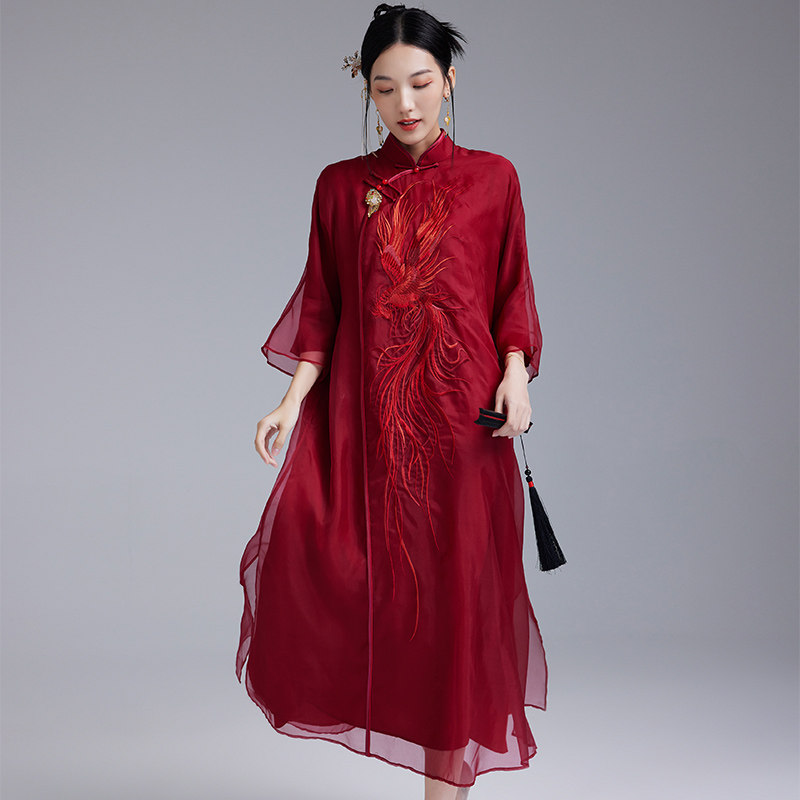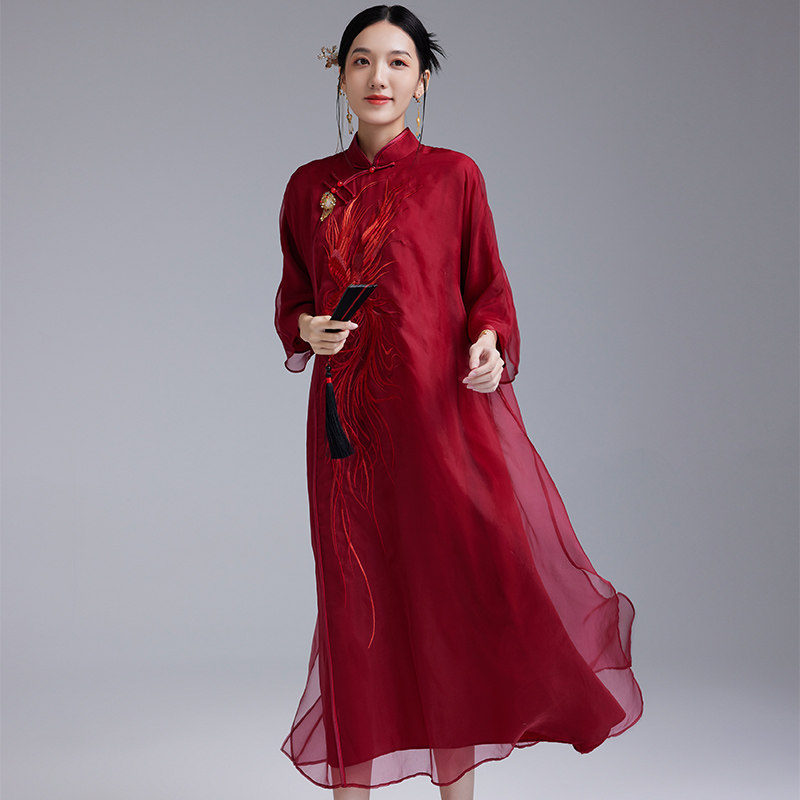 陌遇原创2025年新款中国风复古100%真丝绣花红色旗袍裙中式连衣裙