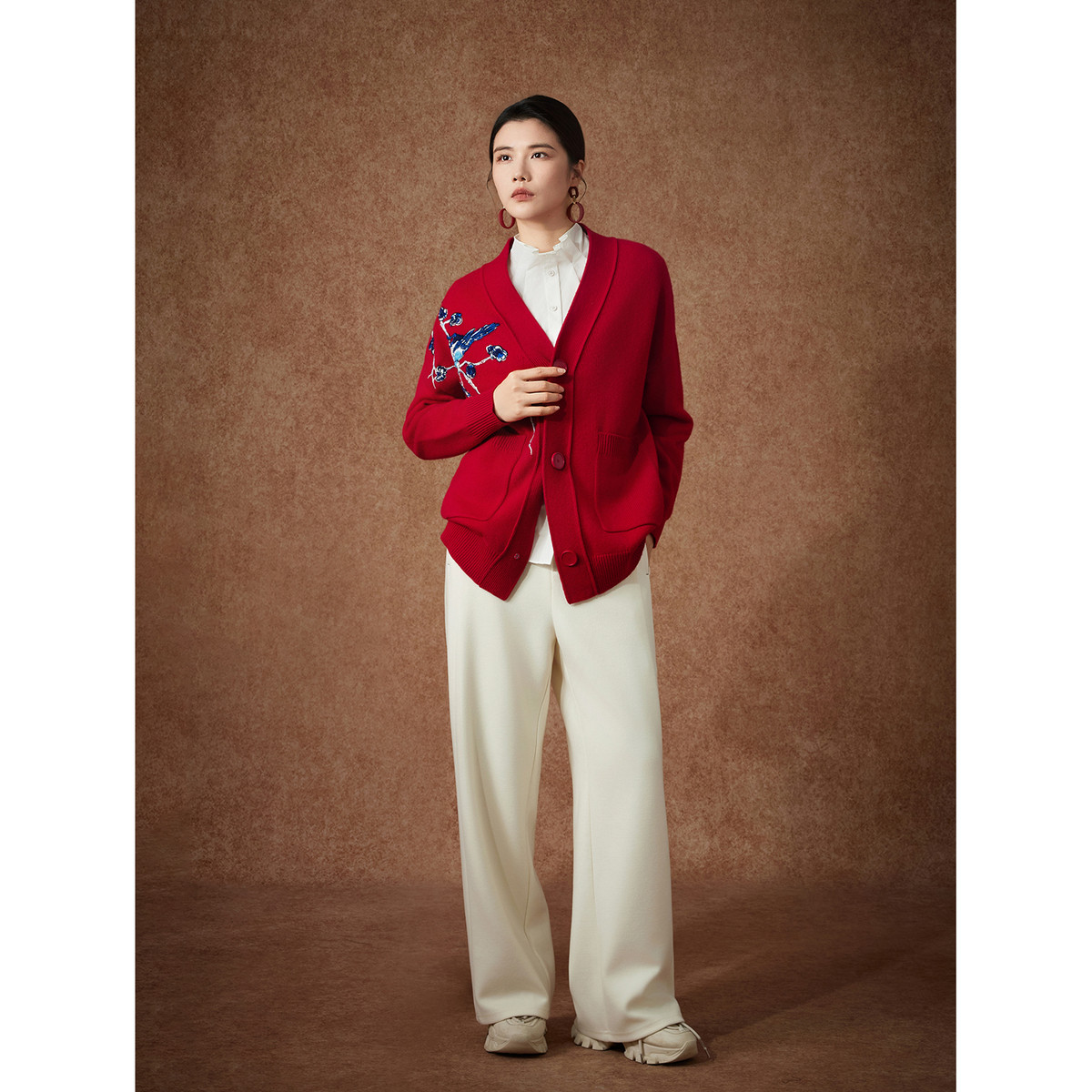 BBLLUUEE/粉蓝衣橱商场同款冬装非遗蜡染喜鹊刺绣简约针织开衫女