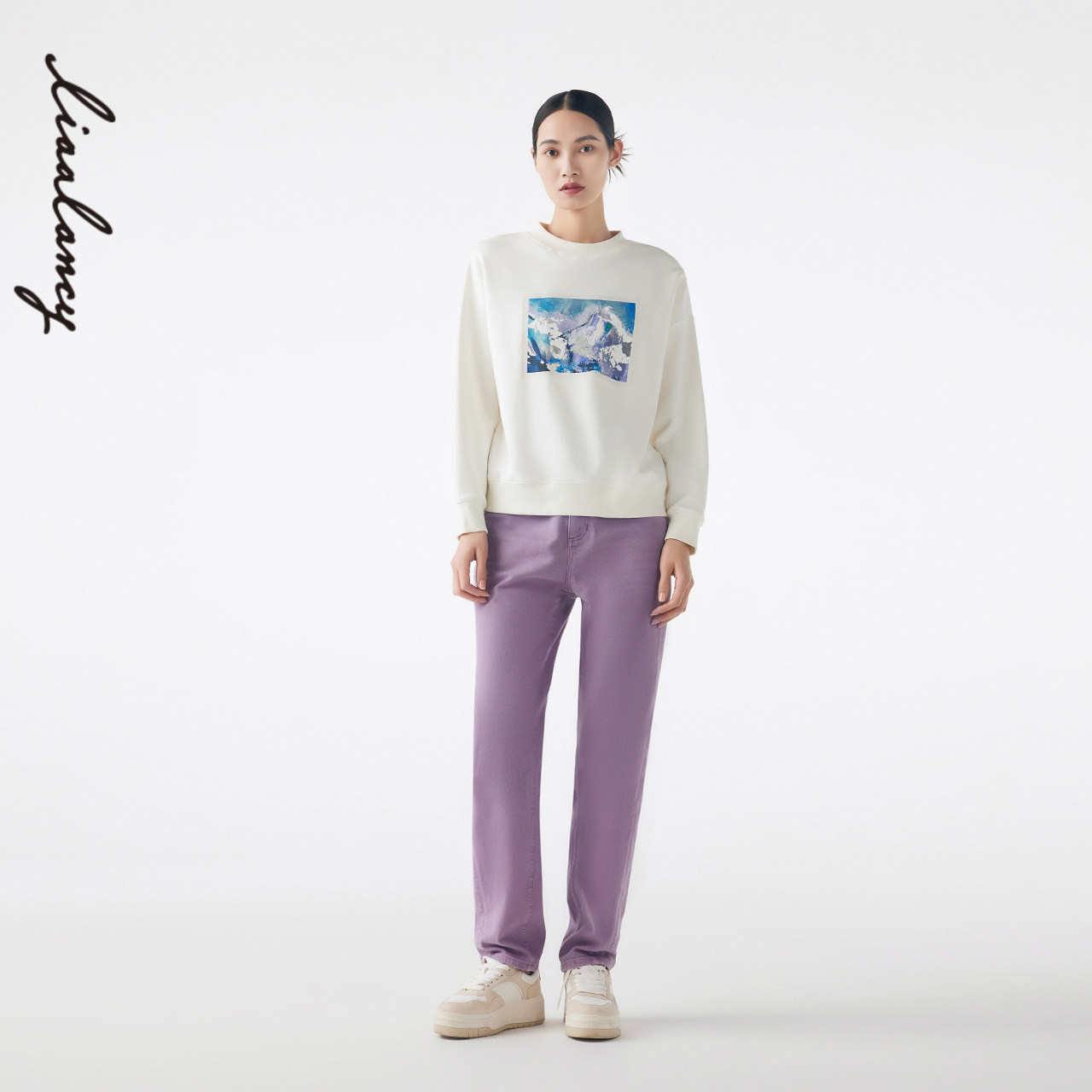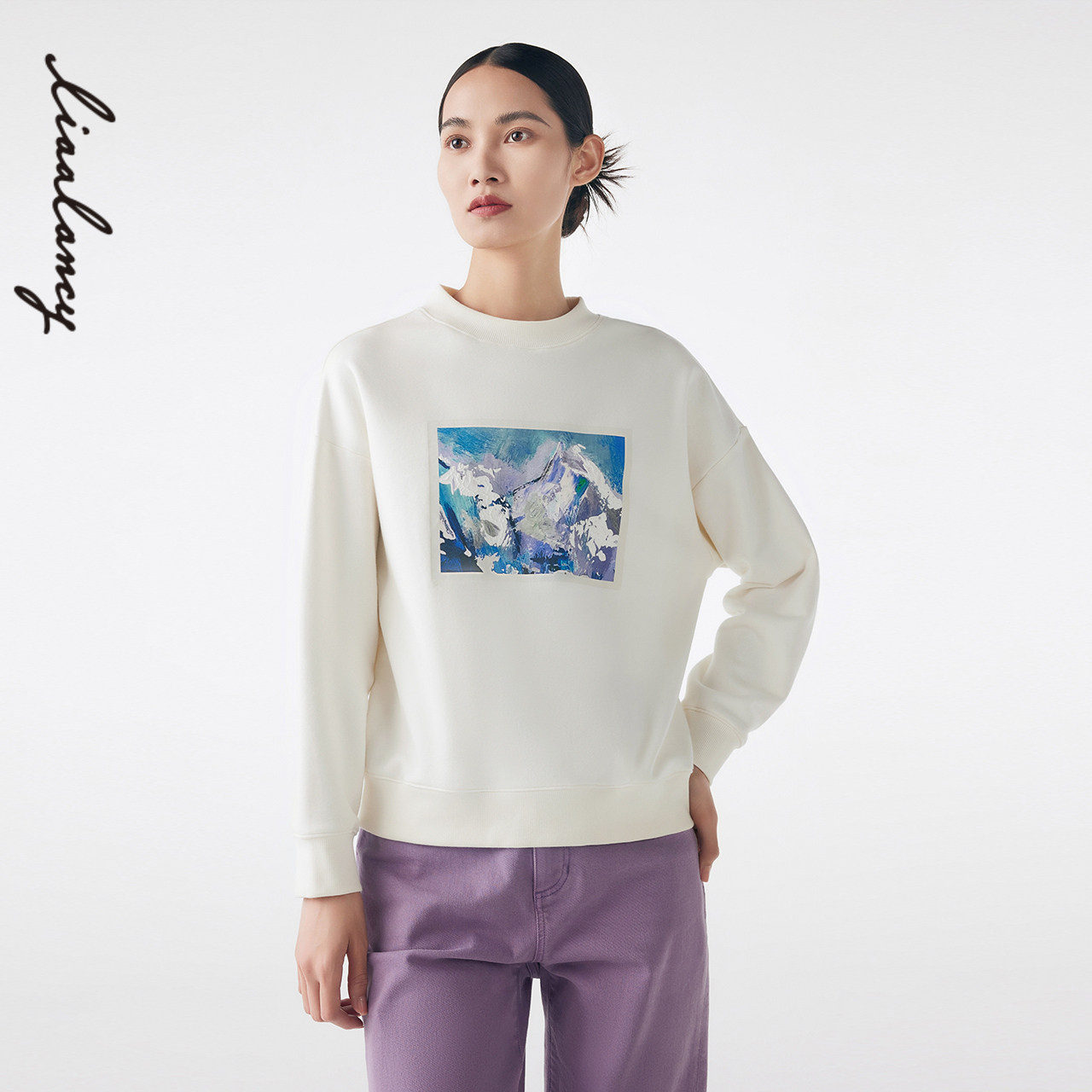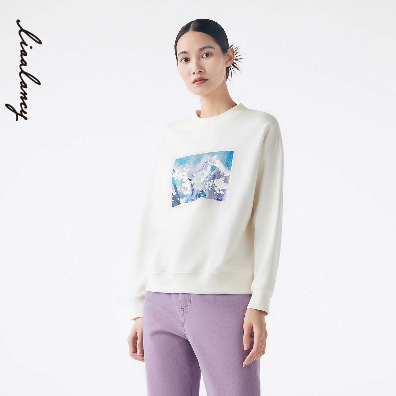 LANCY/朗姿2023秋冬新款圆领长袖宽松薄款卫衣女简约气质印花上衣