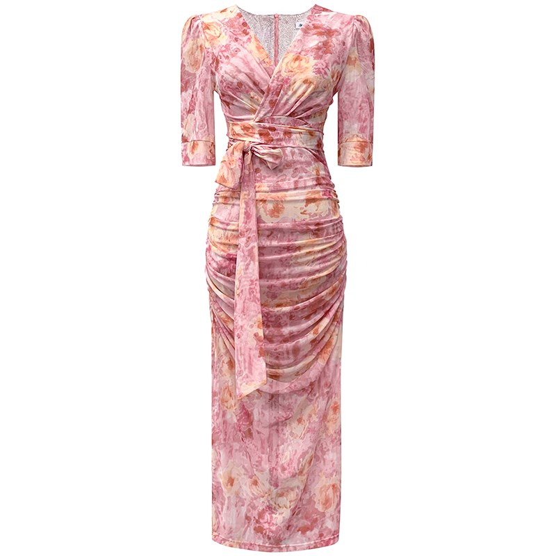 粉色减龄印花连衣裙女夏新款网纱V领短袖绑带褶皱遮肚开叉中长裙