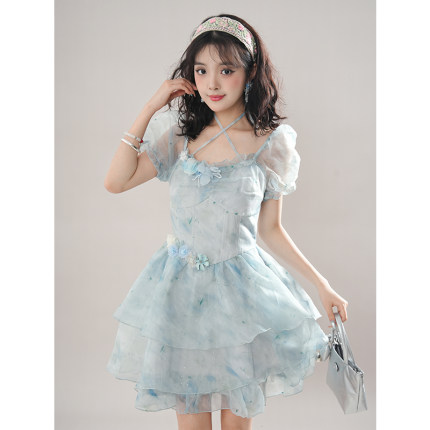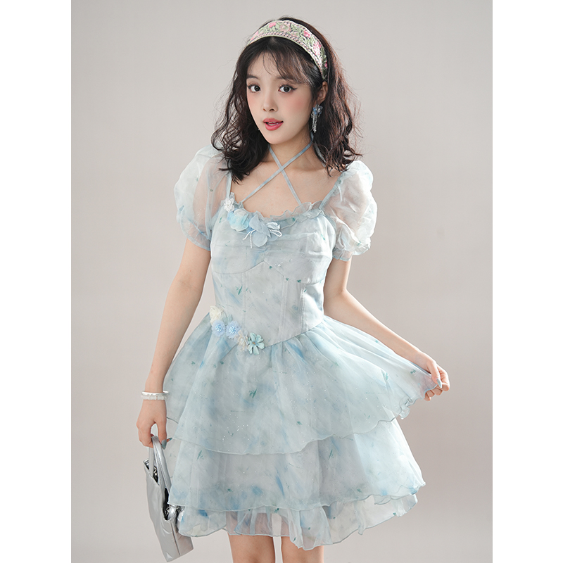 碎梦星野 甜美清新重工细闪连衣裙减龄挂脖网纱立体花朵蓬蓬短裙