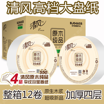 清风商用大盘卷纸卫生纸家用大盘纸家庭装四层加厚整箱空心卷筒纸