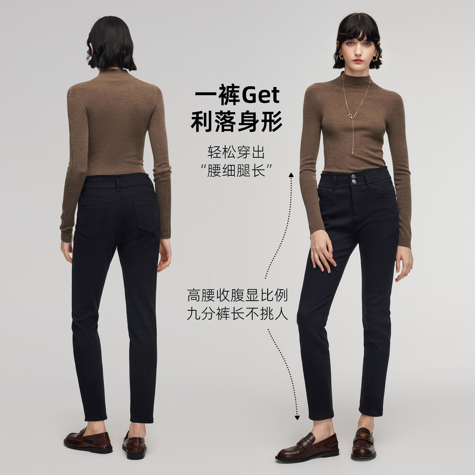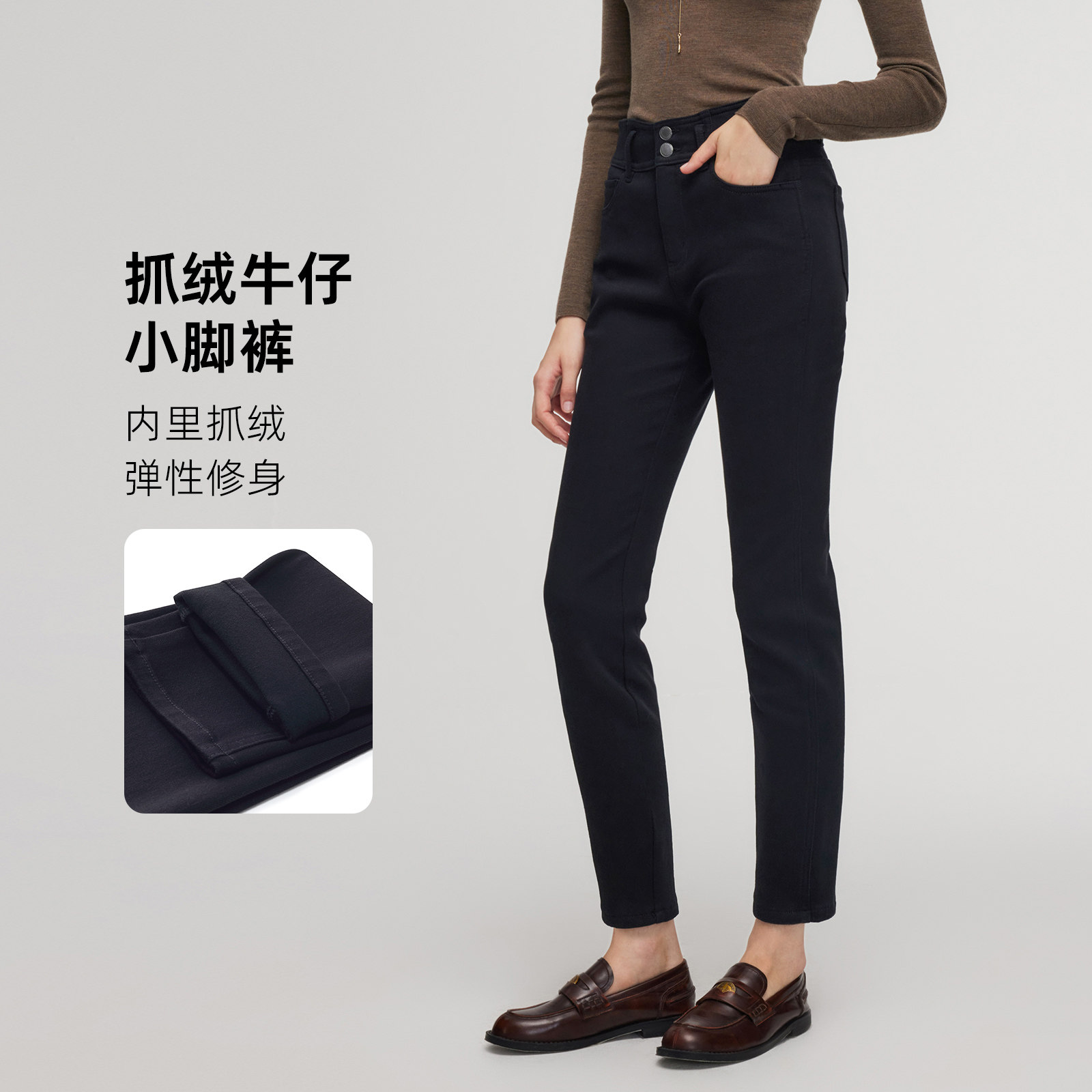 歌莉娅冬季高腰抓绒小脚牛仔长裤