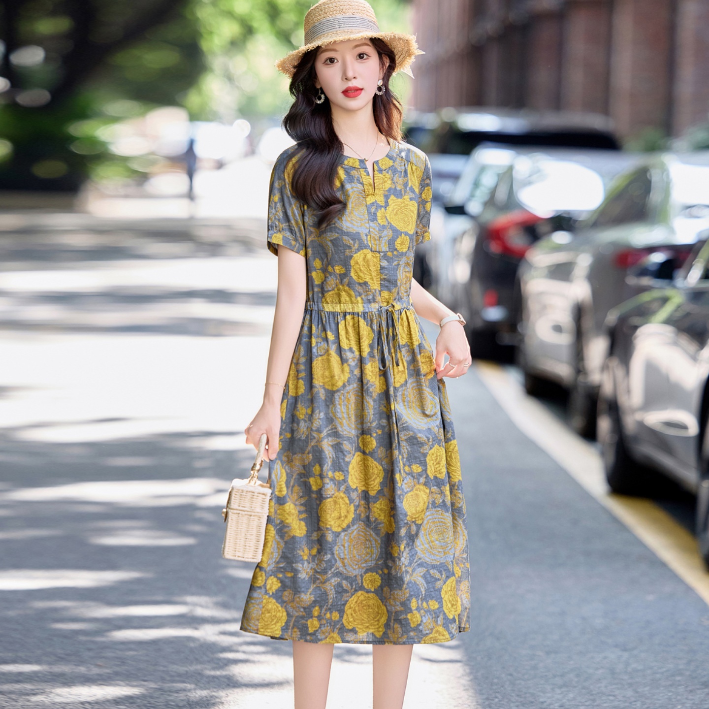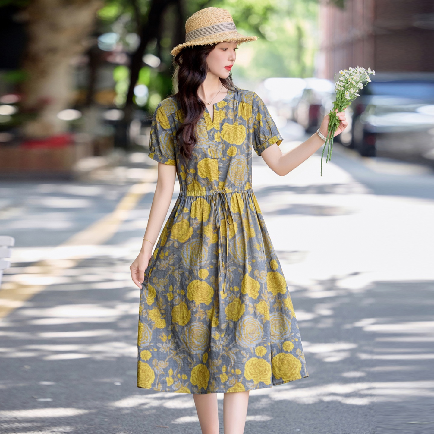 素雅订制女装原创品牌2025夏季新款高级感收腰显瘦碎花棉麻连衣裙