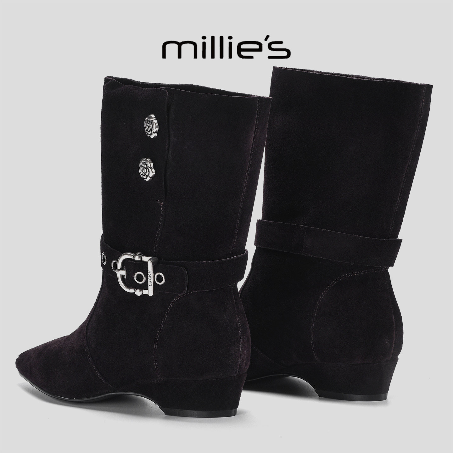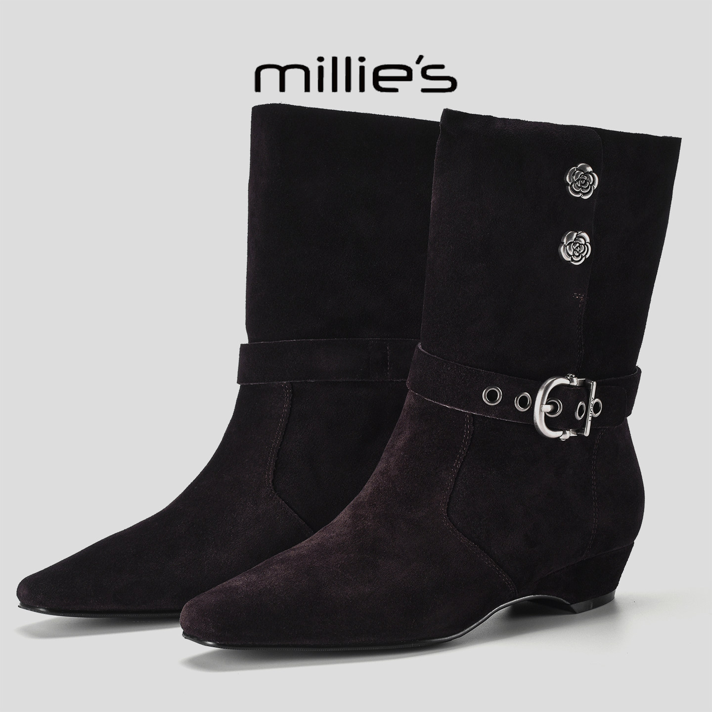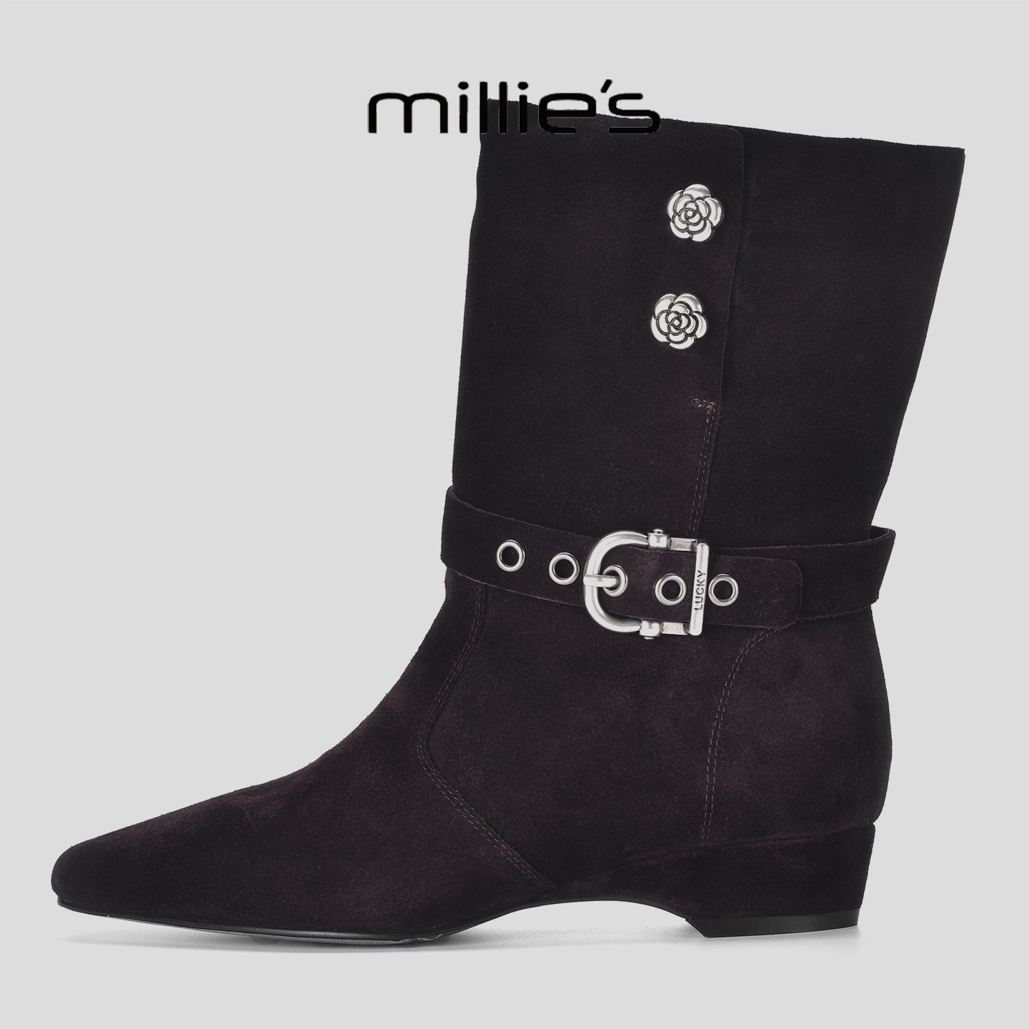 MILLIE'S/妙丽2025新款英伦风时尚加绒保暖短靴皮带扣西部机车靴