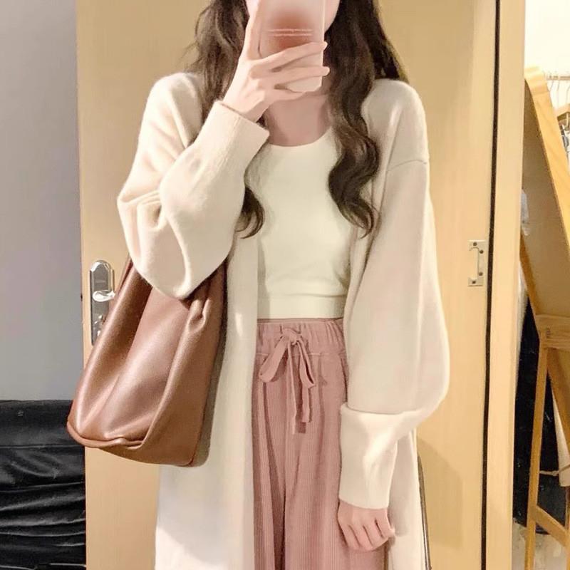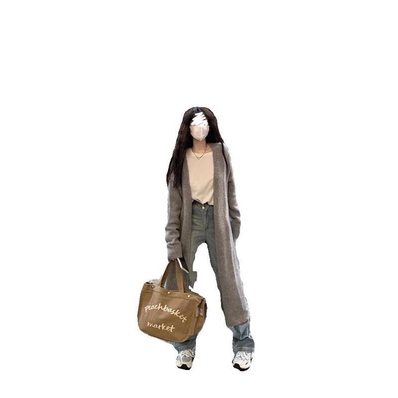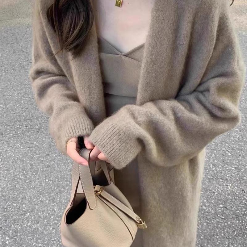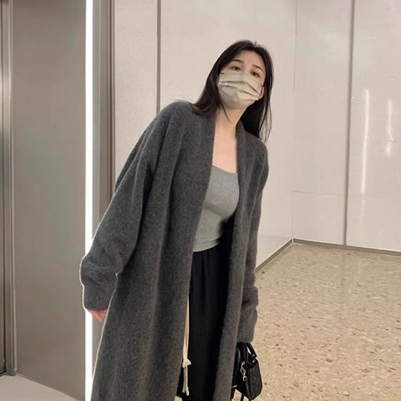 灰色中长款过膝毛衣外套女春秋冬季慵懒风加厚百搭针织衫开衫大衣