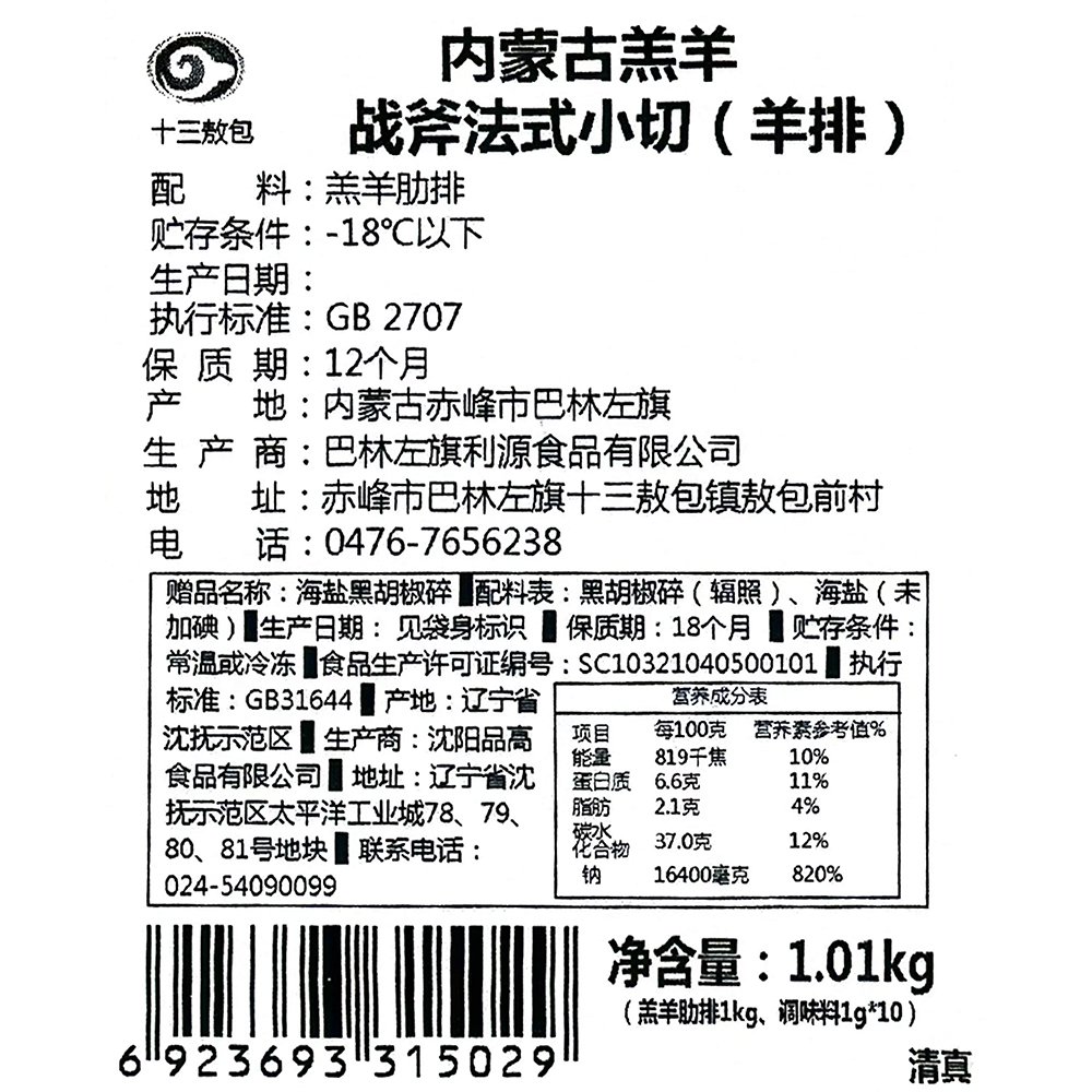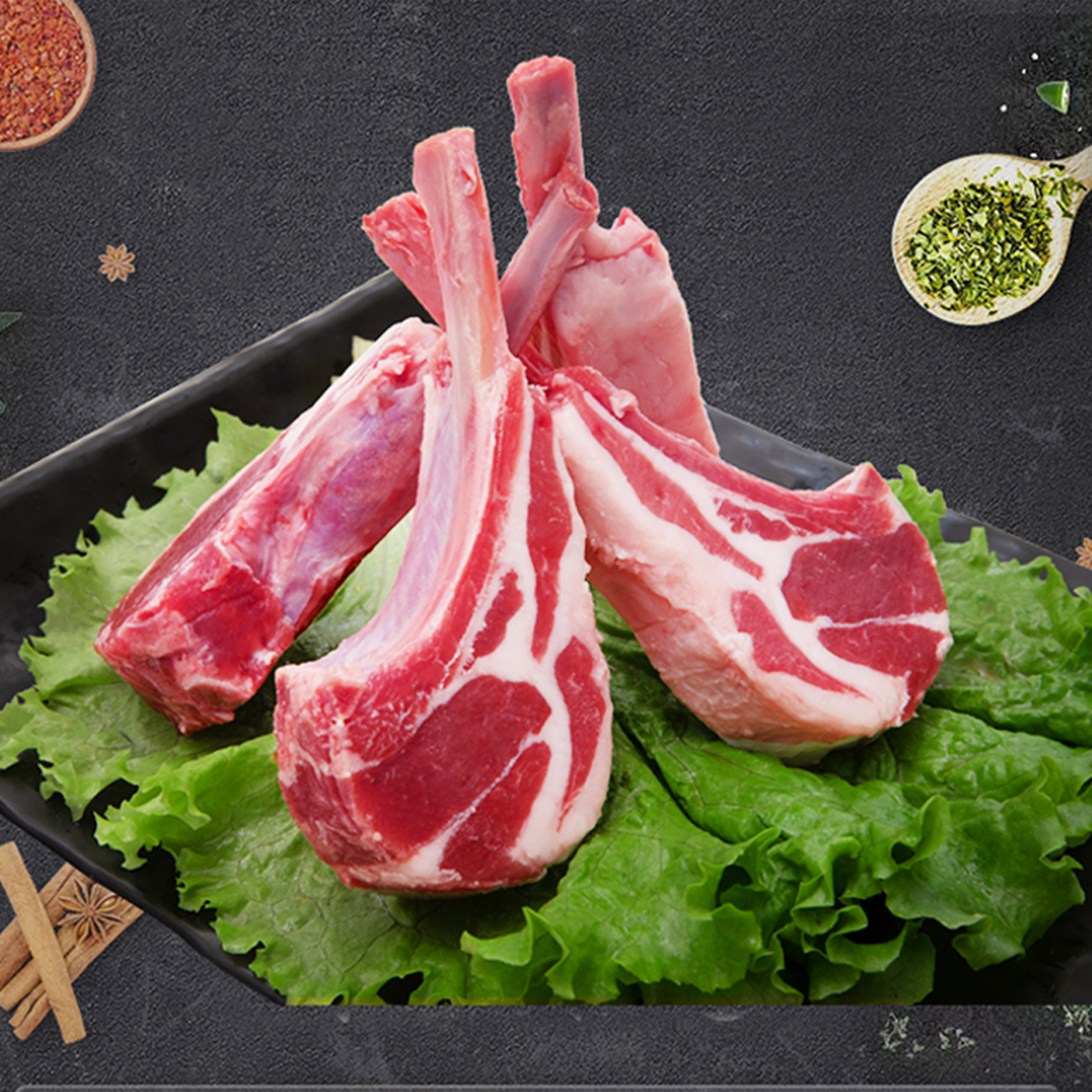 内蒙古羔羊战斧法式小切(羊排) 1kg+赠海盐黑胡椒碎1g*10