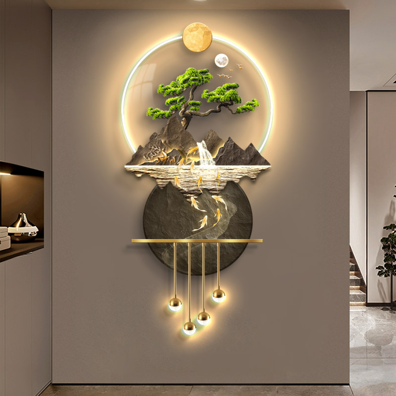 迎客松玄关装饰画流水生财壁画走廊LED灯光挂画山水立体艺术壁灯