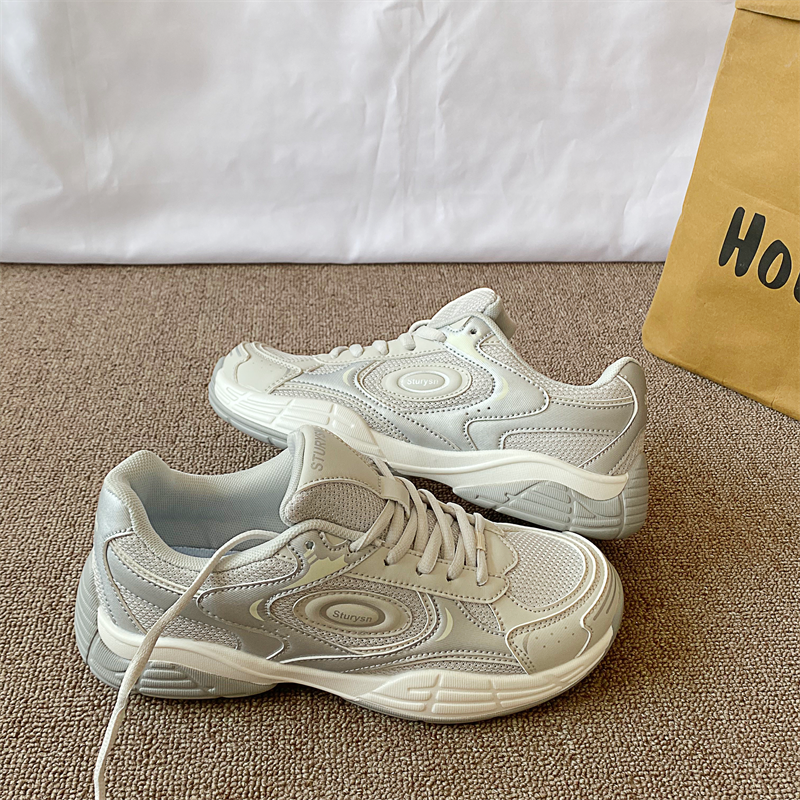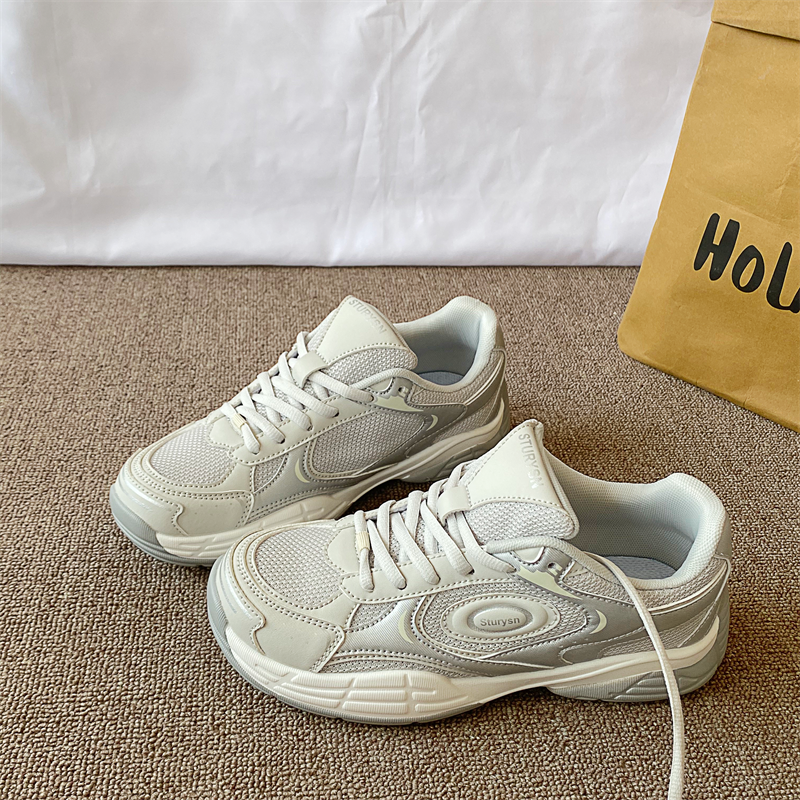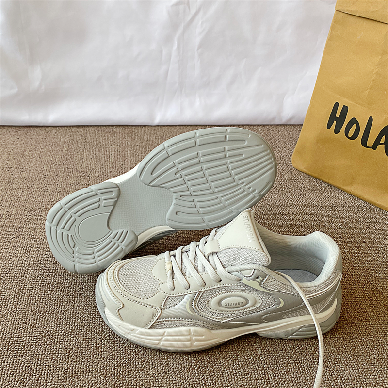 港风复古浅灰色运动鞋女ins潮2025冬季新款网面透气休闲老爹鞋子