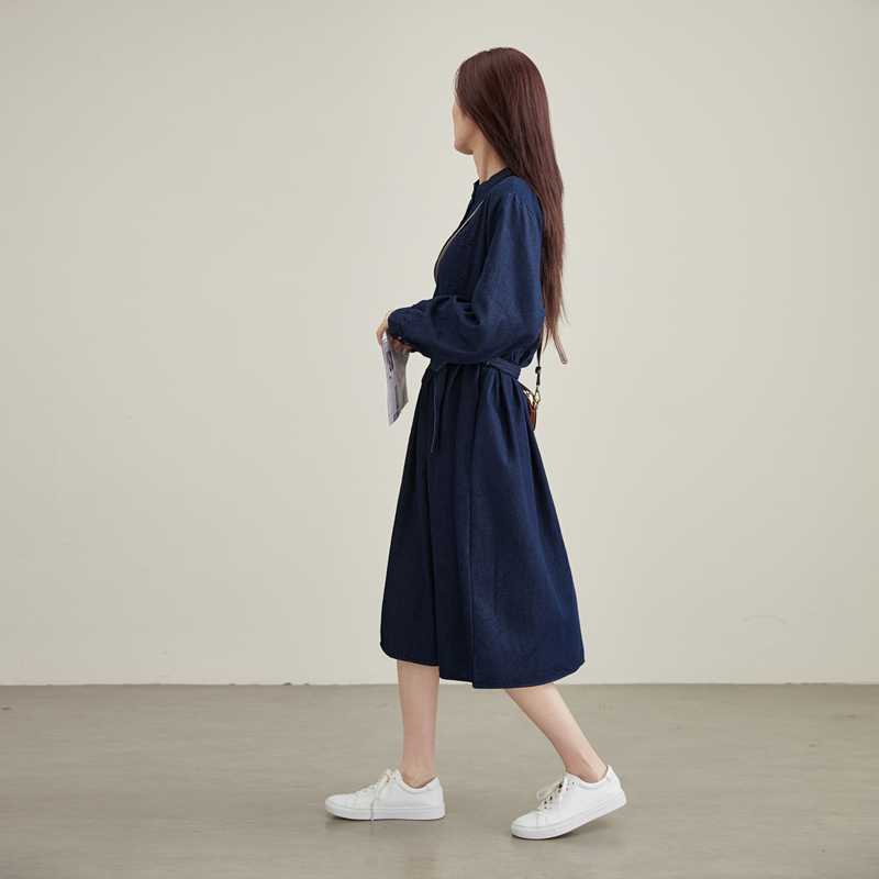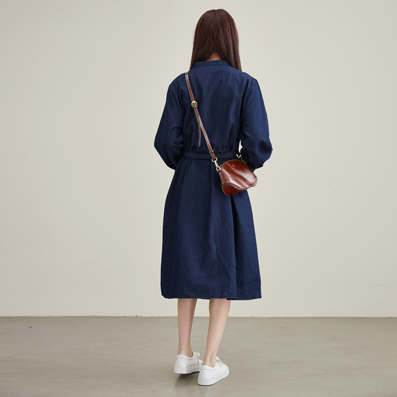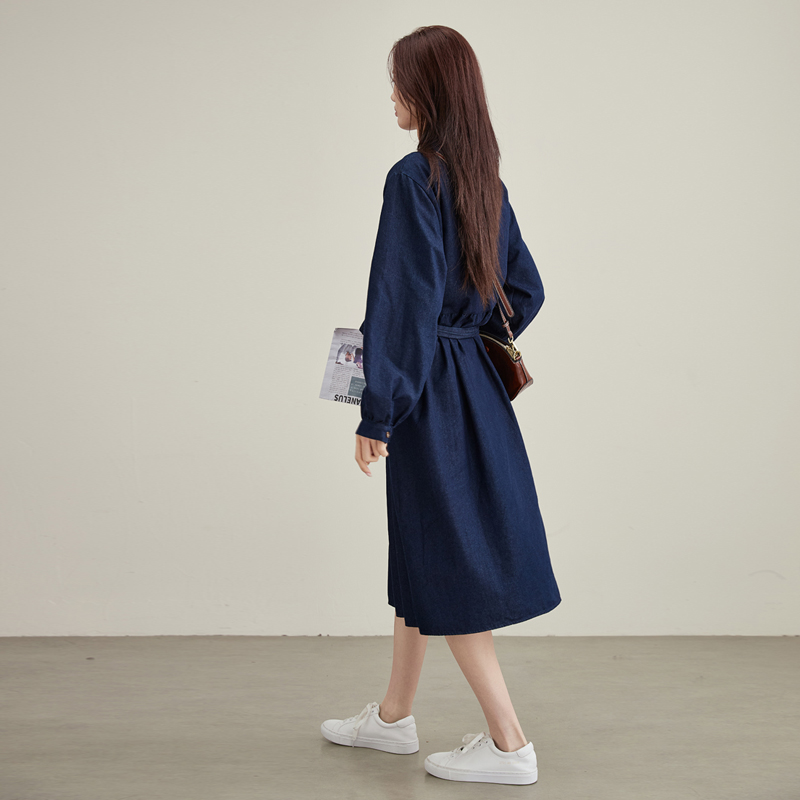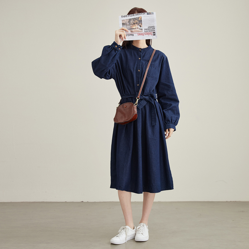 柒宜原创日系全棉牛仔连衣裙女宽松长袖森女复古休闲纯棉牛仔长裙