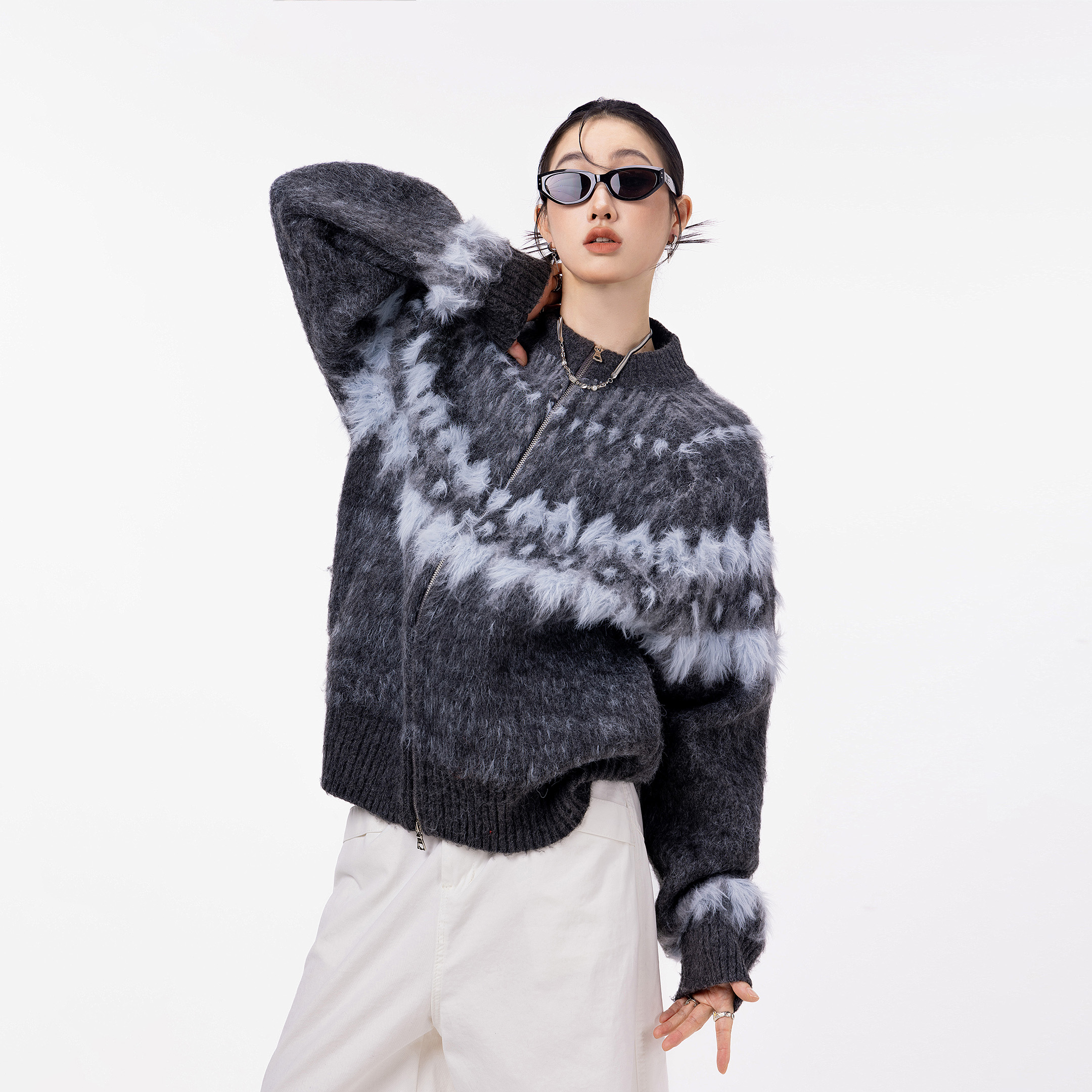 ICH MODE 美式费尔岛撞色针织开衫女秋冬季拉链毛衣外套长袖上衣