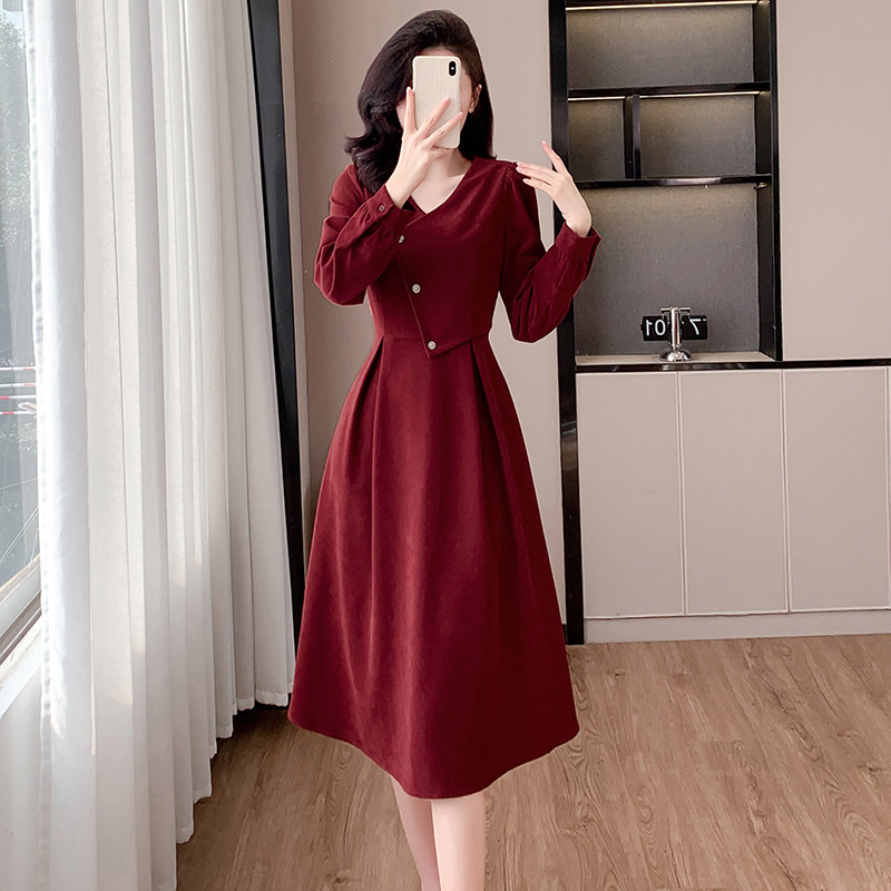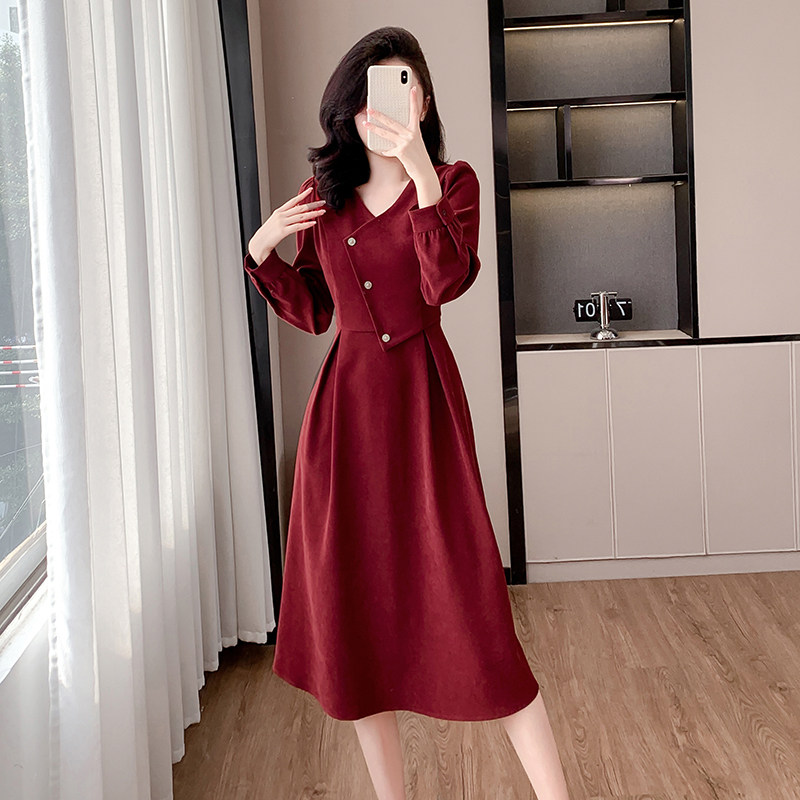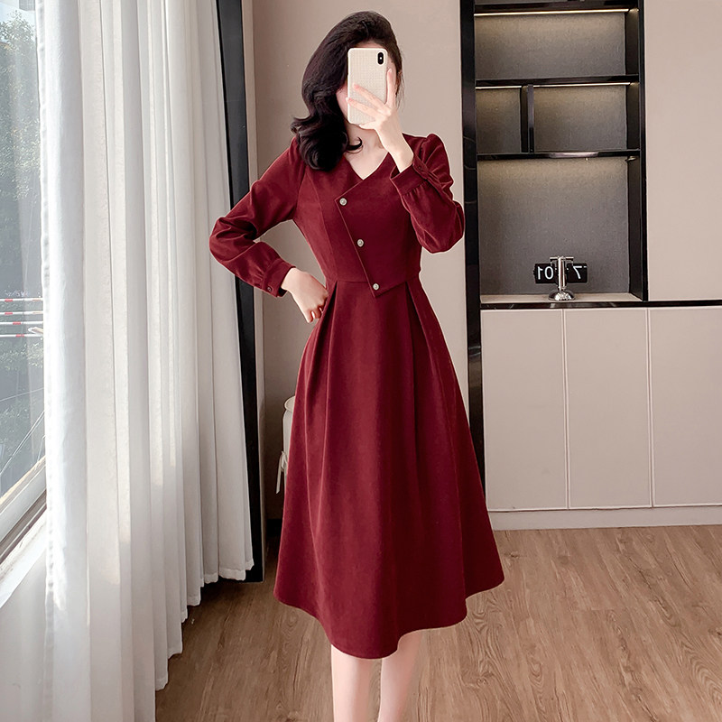 实拍浪漫复古新年红连衣裙女春秋法式赫本磨毛V领裙子高级感