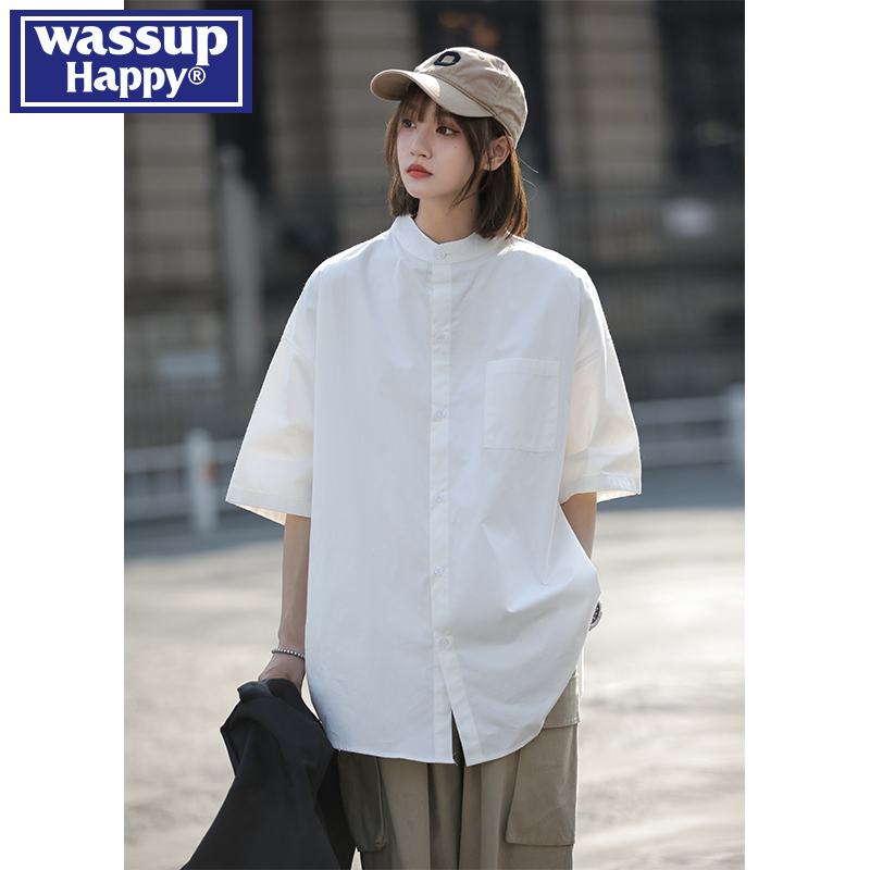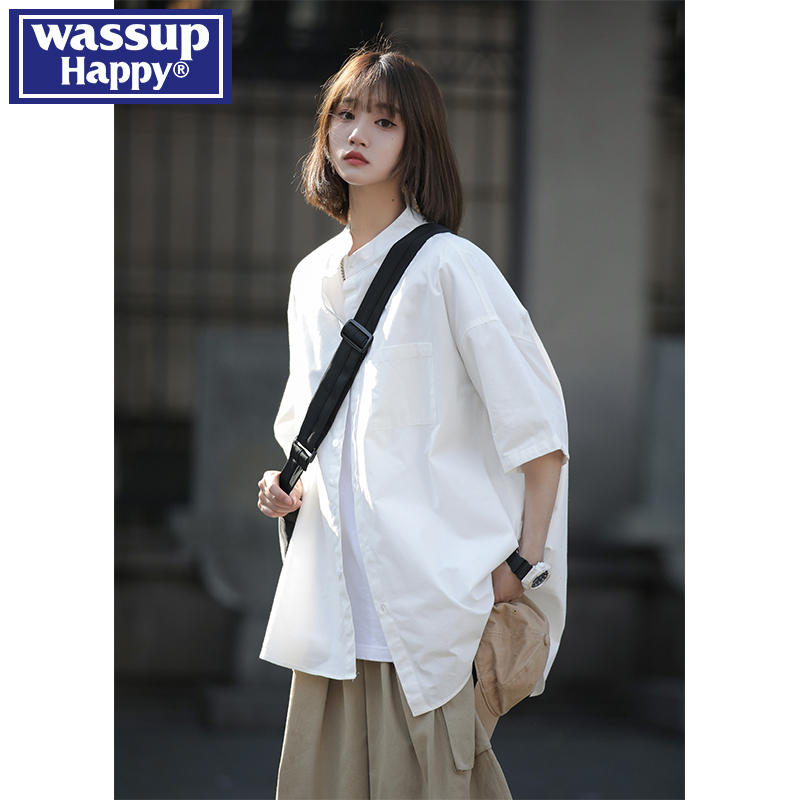 wassup happy日系短袖衬衫男夏季薄款潮牌简约七分袖情侣休闲外套