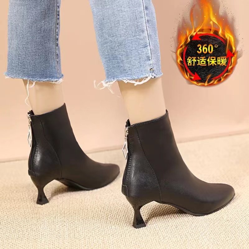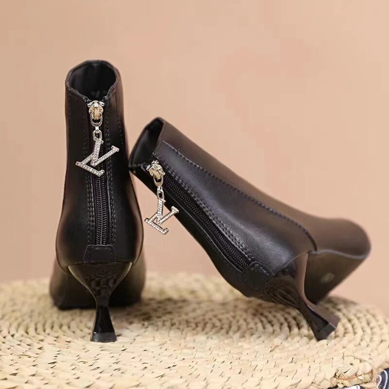 品牌真软皮短靴女靴2025秋冬新款尖头高跟细跟加绒百搭瘦瘦马丁靴