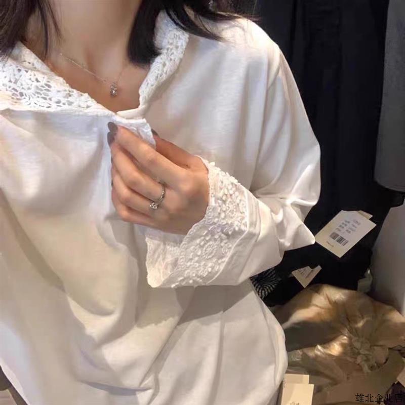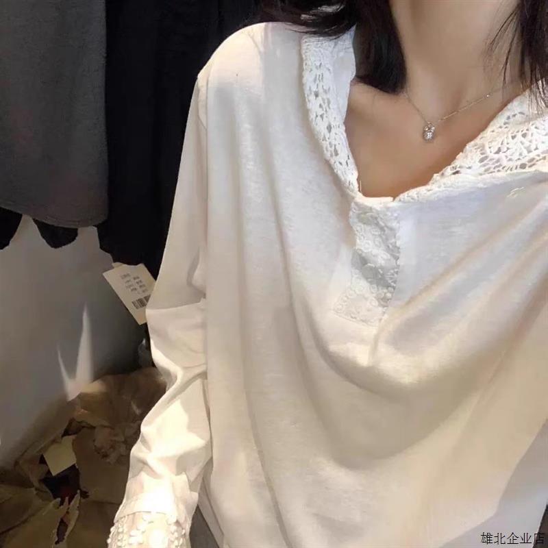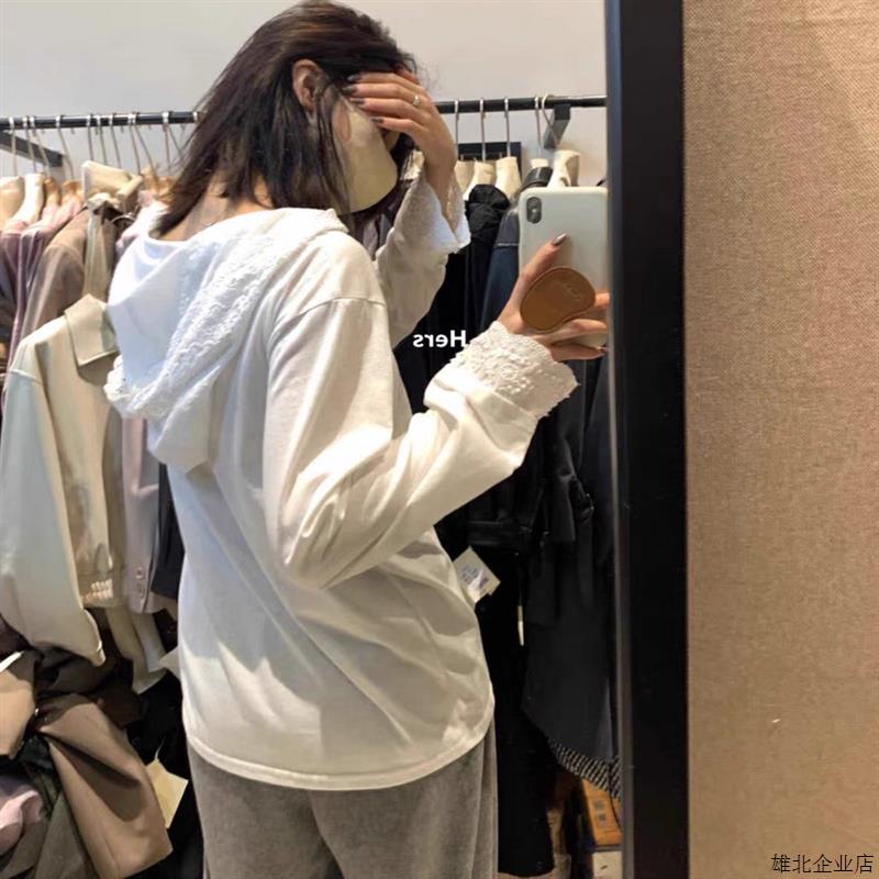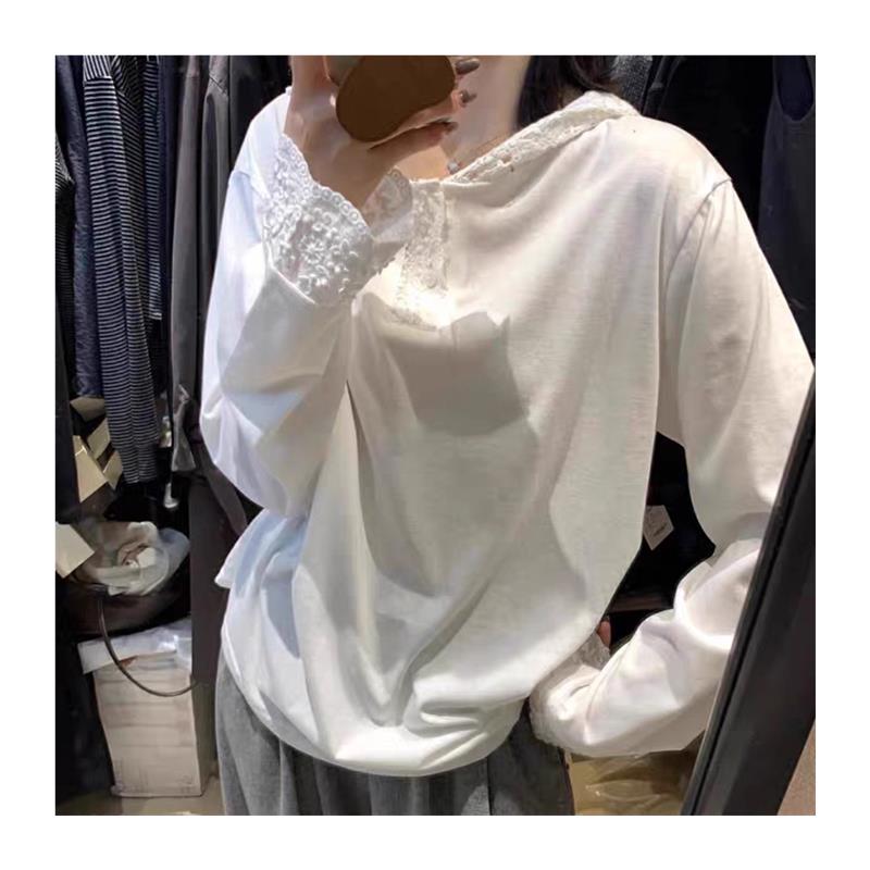 法式蕾丝花边连帽长袖t恤秋季洋气减龄宽松白色内搭打底衫上衣女
