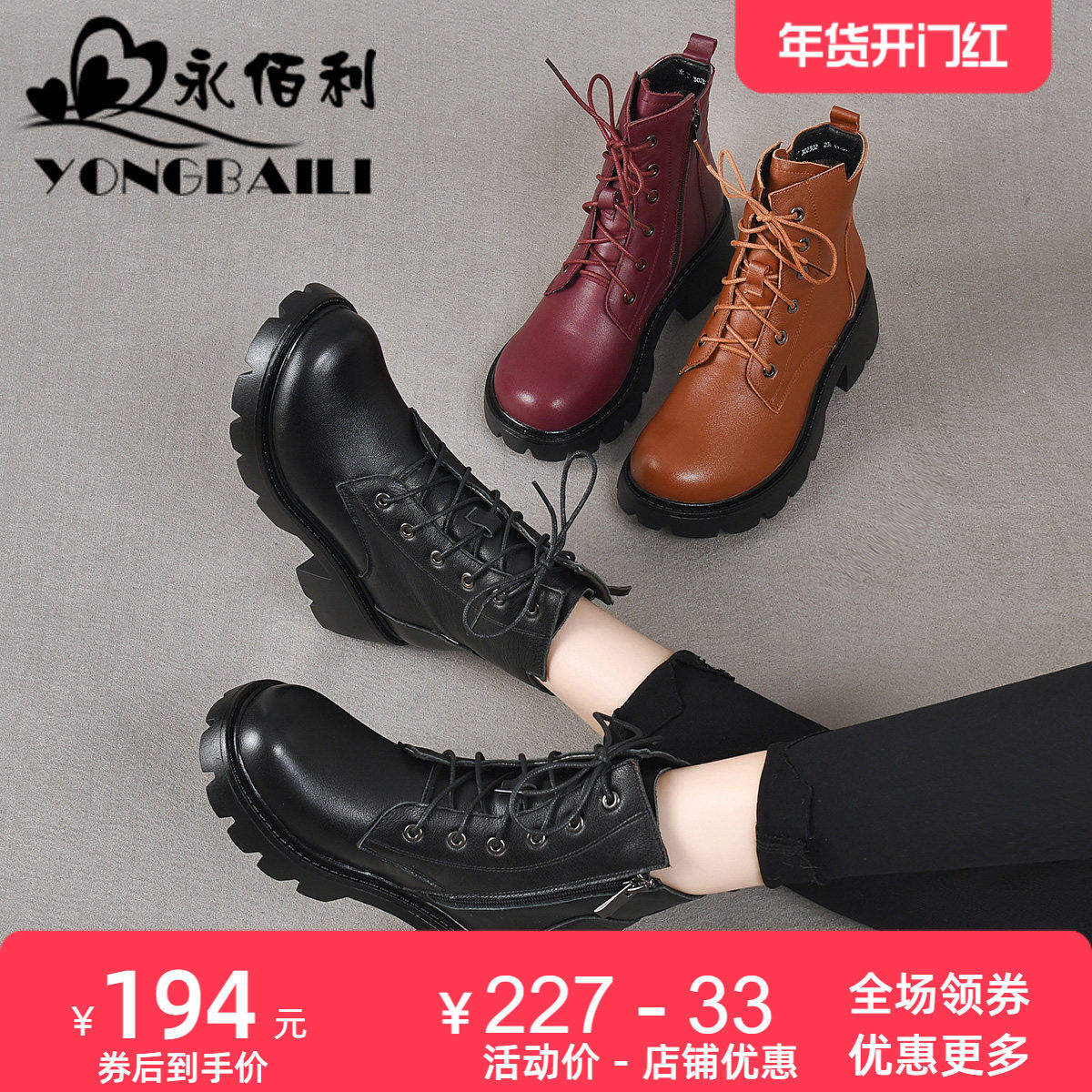 永佰利休闲时装靴粗跟真皮皮靴