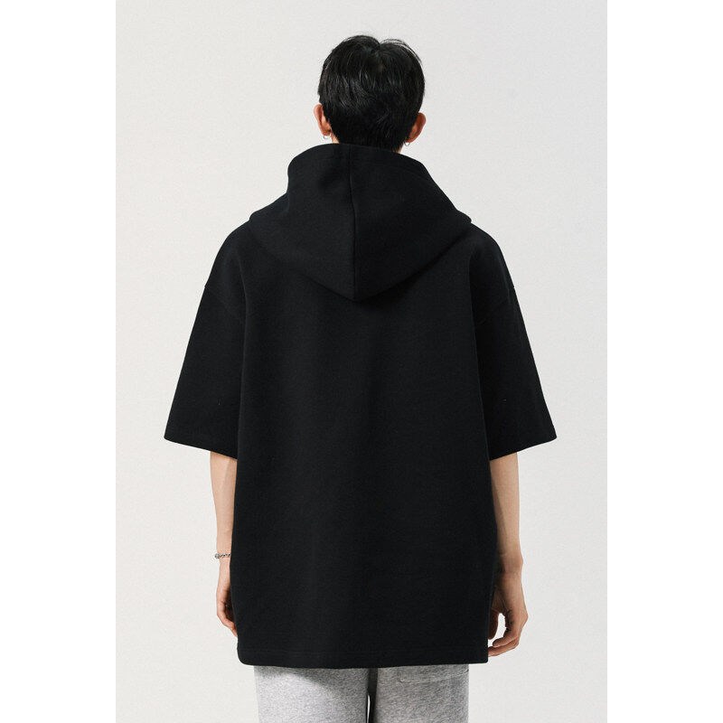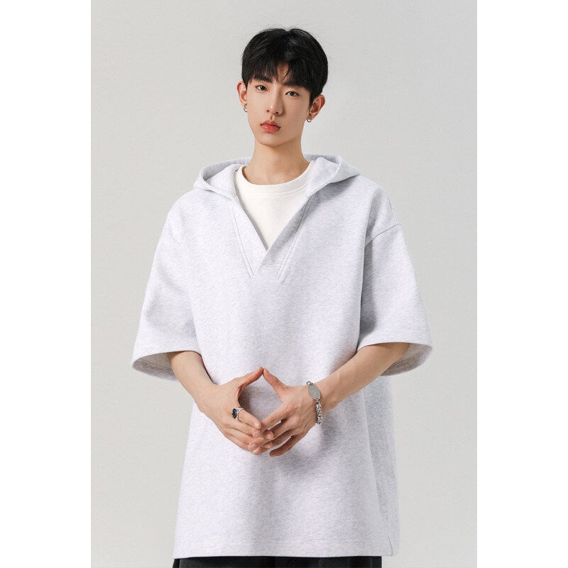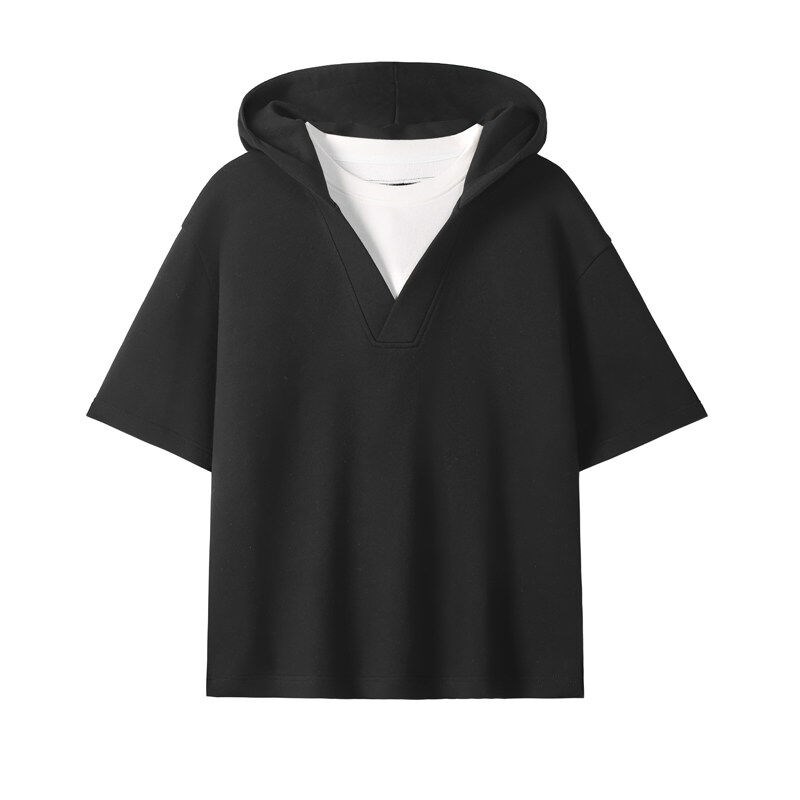 港风假两件连帽短袖男款夏季新款大码半袖上衣青少年休闲宽松T恤