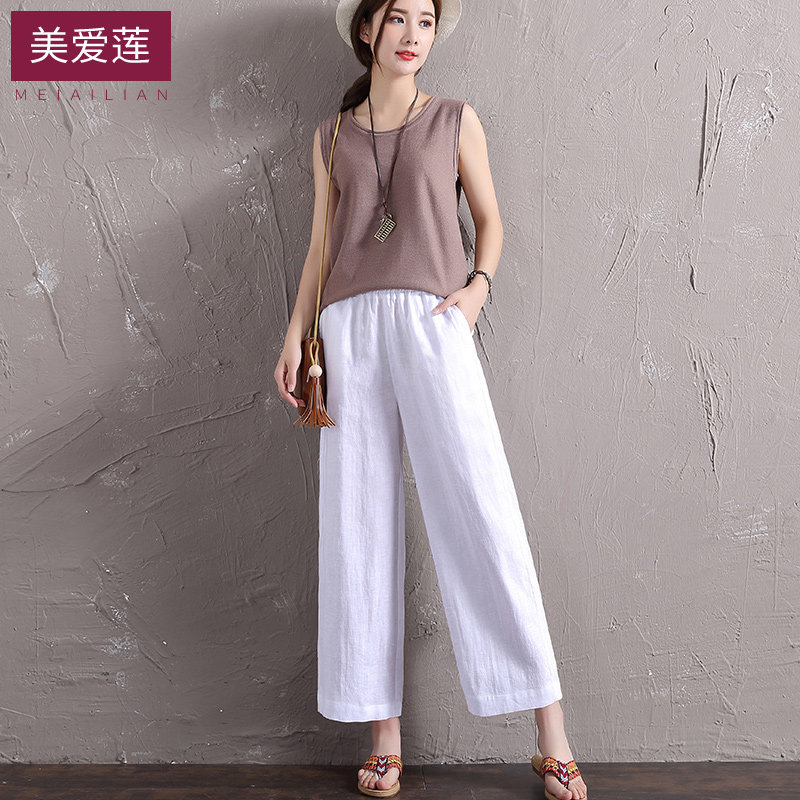 高端亚麻阔腿裤女九分春夏新款大码亚麻女裤文艺宽松麻料薄款防晒