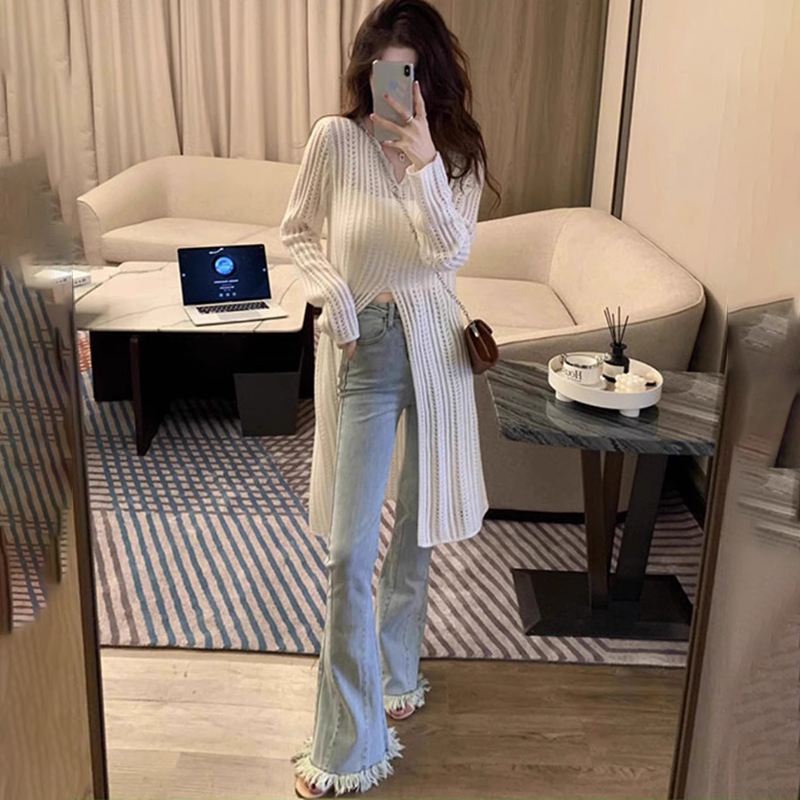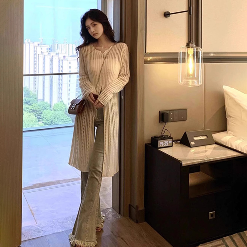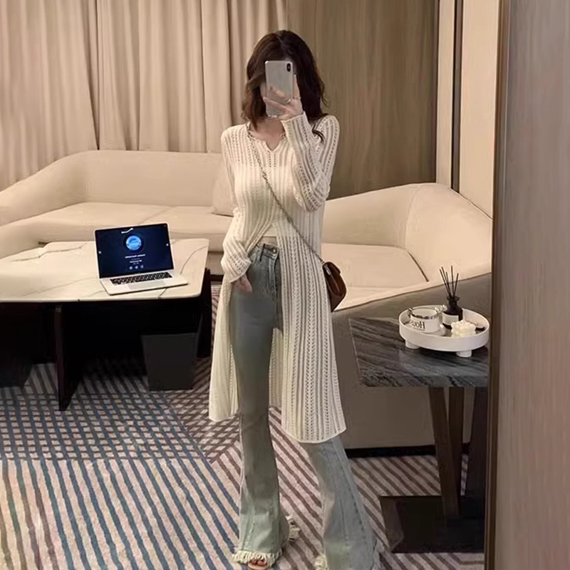 设计感小众镂空长袖防晒罩衫女薄款夏季宽松中长款开叉针织连衣裙