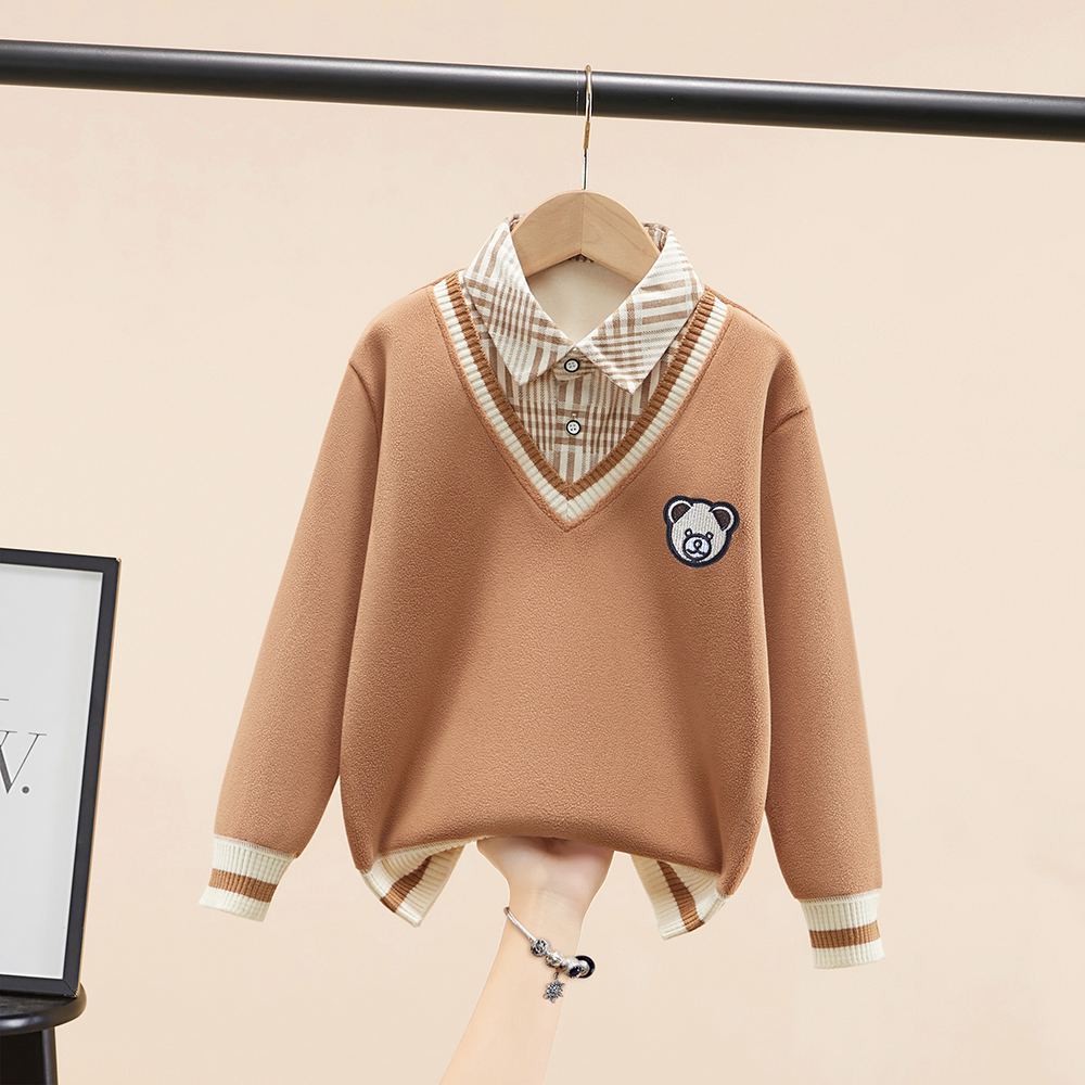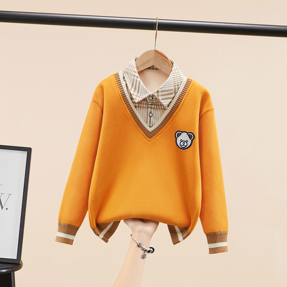 男童假两件衬衫毛衣儿童装套头秋冬款加厚一体绒中大童男孩打底衫