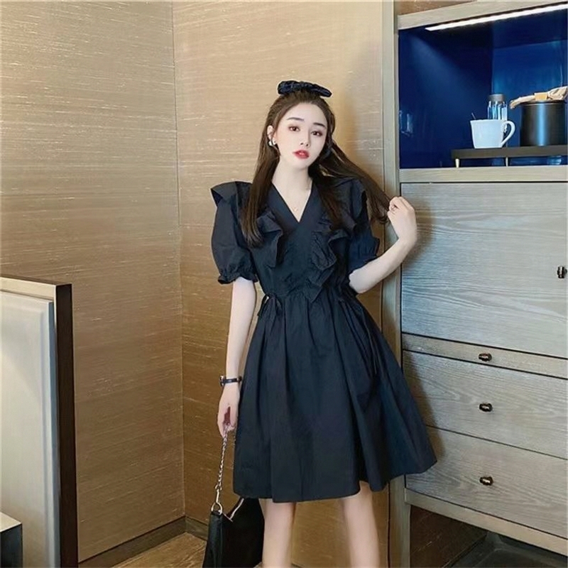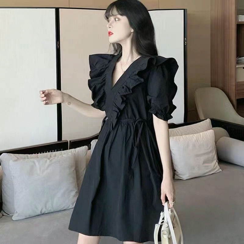小个子小黑裙显瘦气质泡泡袖法式衬衫裙2025黑色赫本连衣裙春夏女