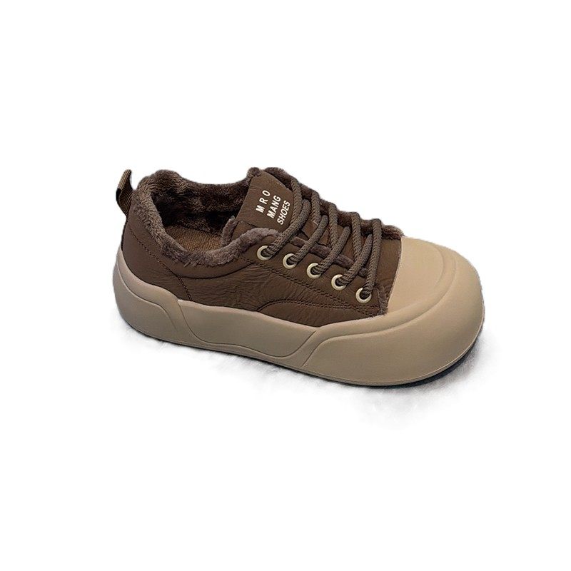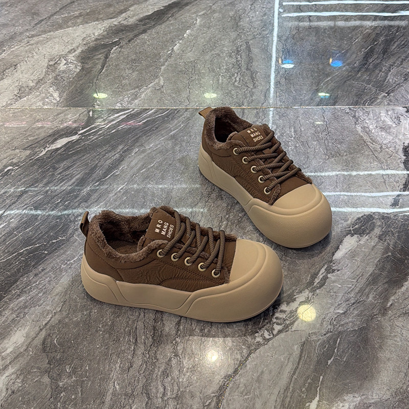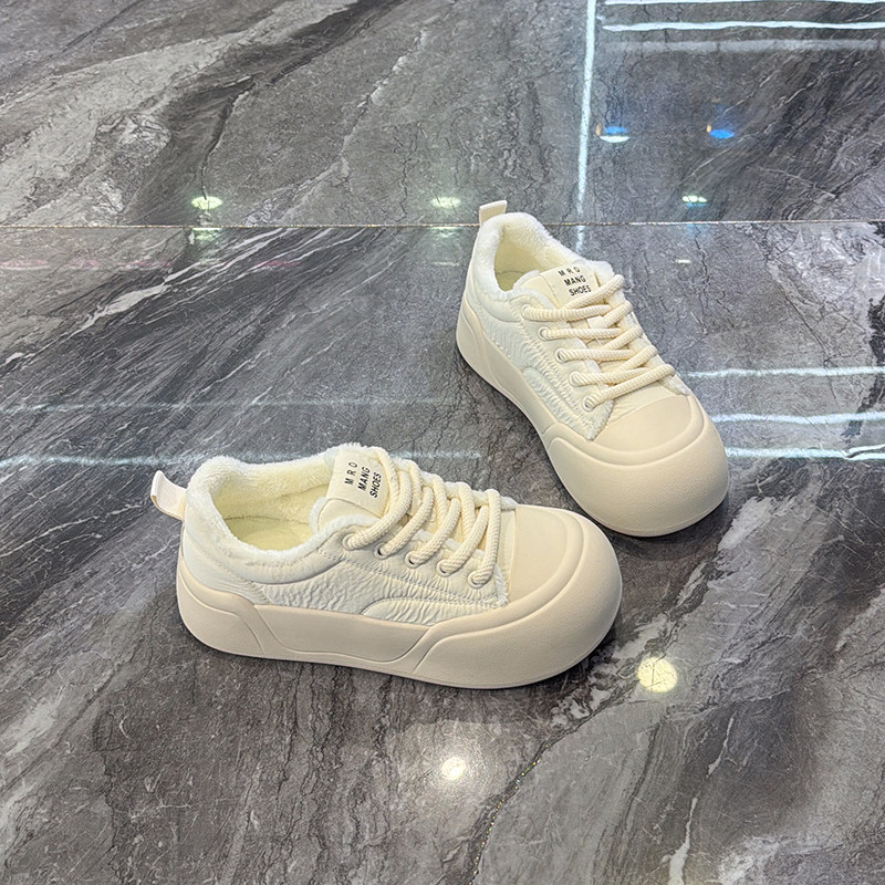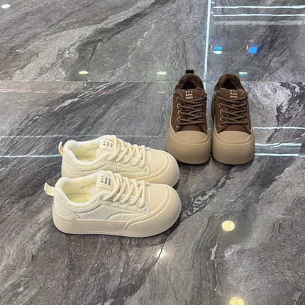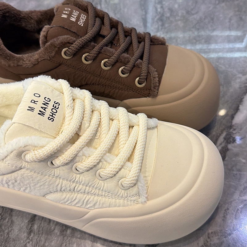 韩系百搭厚底加绒板鞋女2025冬新款丑萌系带小白鞋保暖舒适面包鞋
