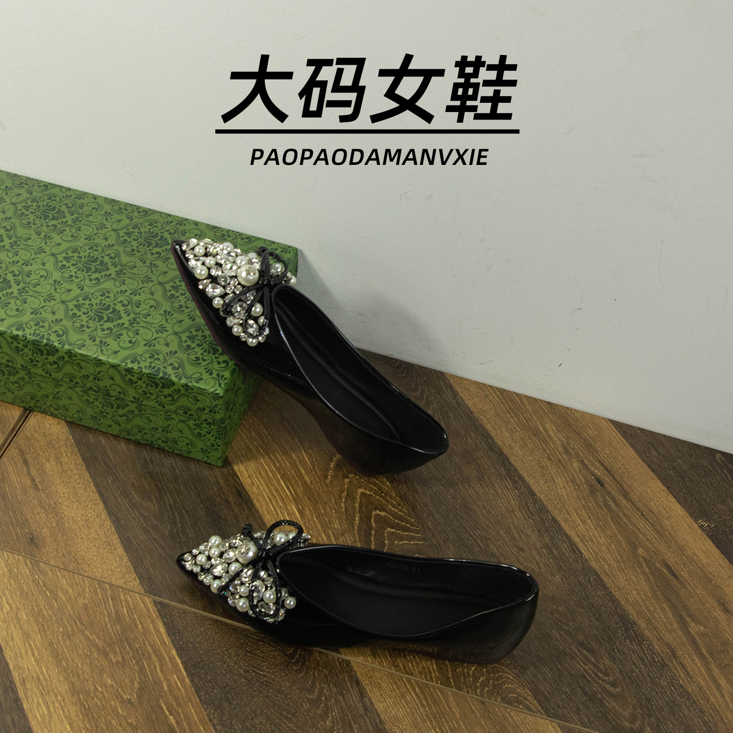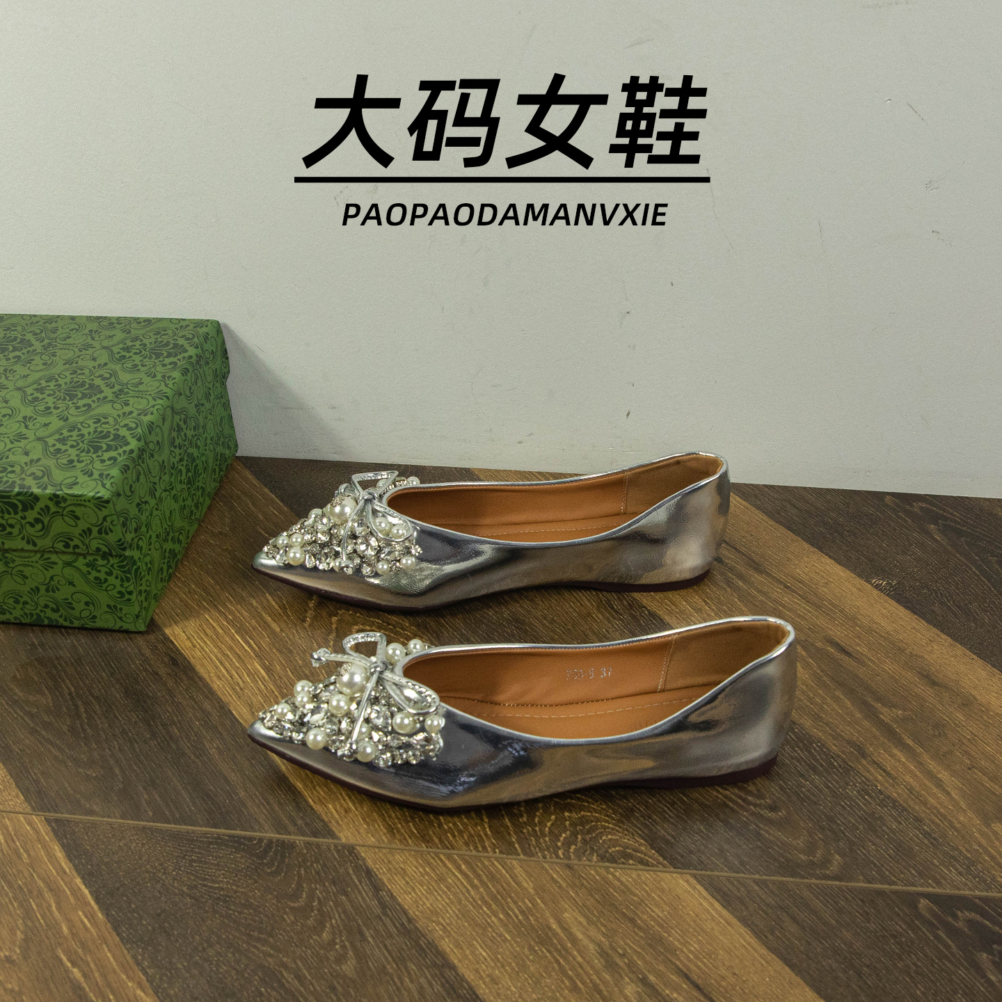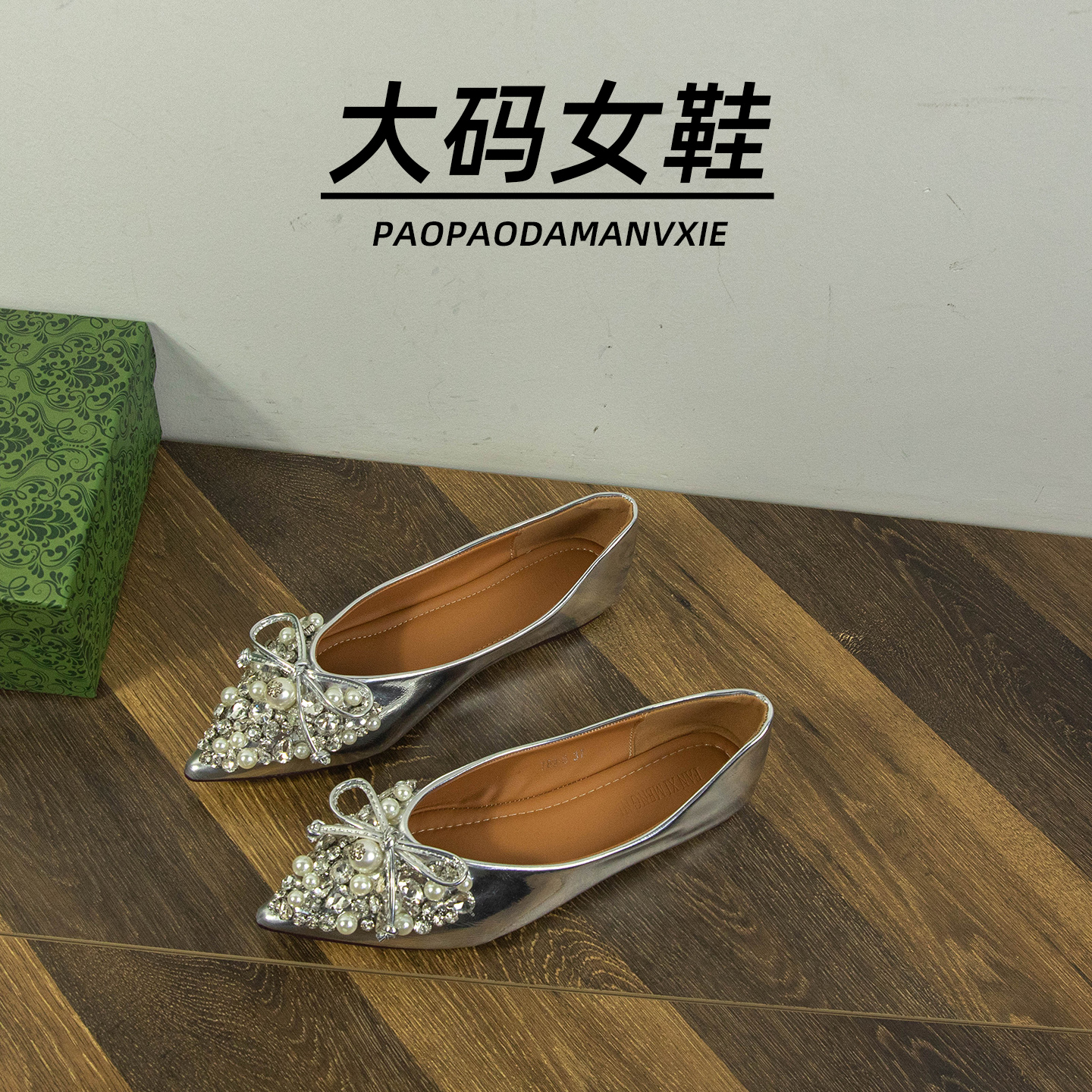大码女鞋41到42宽脚胖单鞋2025新款法式方头水钻平底尖头浅口瓢鞋