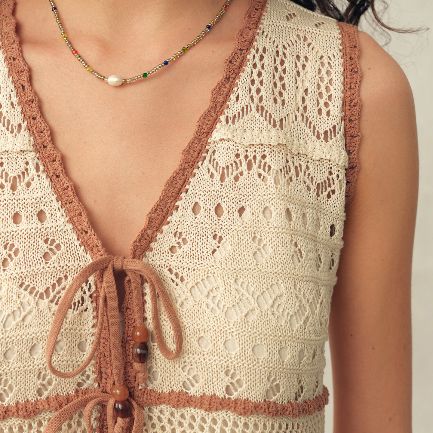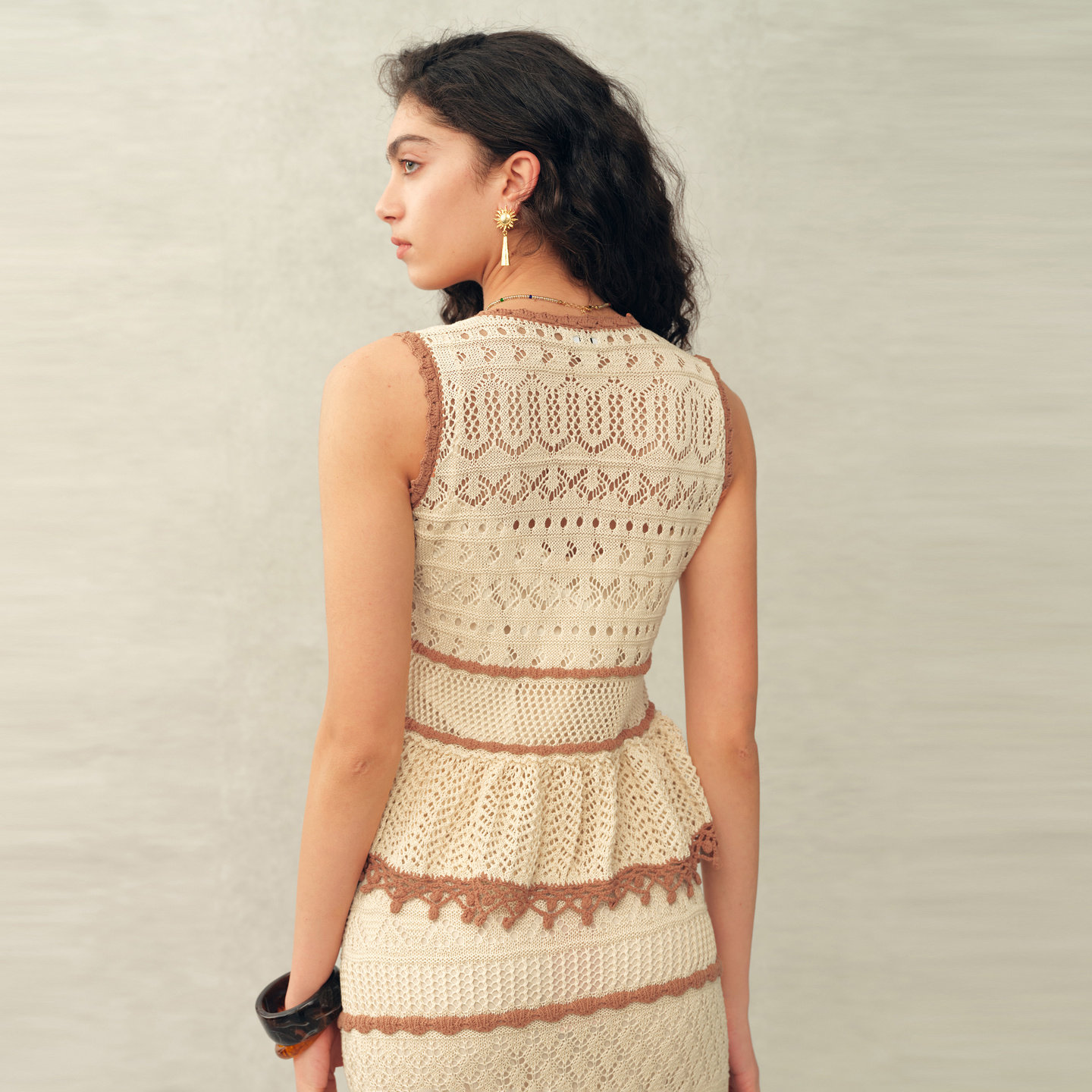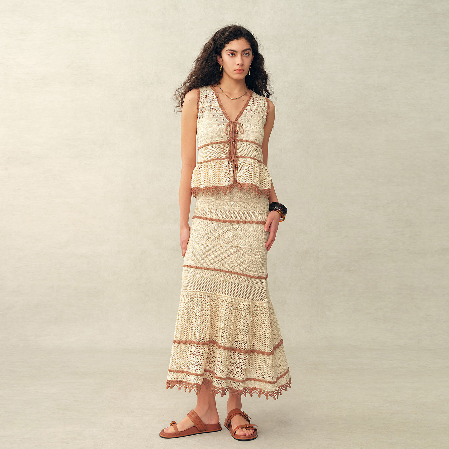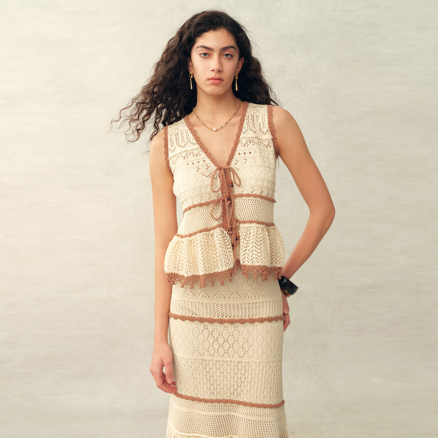 【本周新品】Fabrique 米杏色拼接蕾丝V领针织背心与鱼尾半裙套装