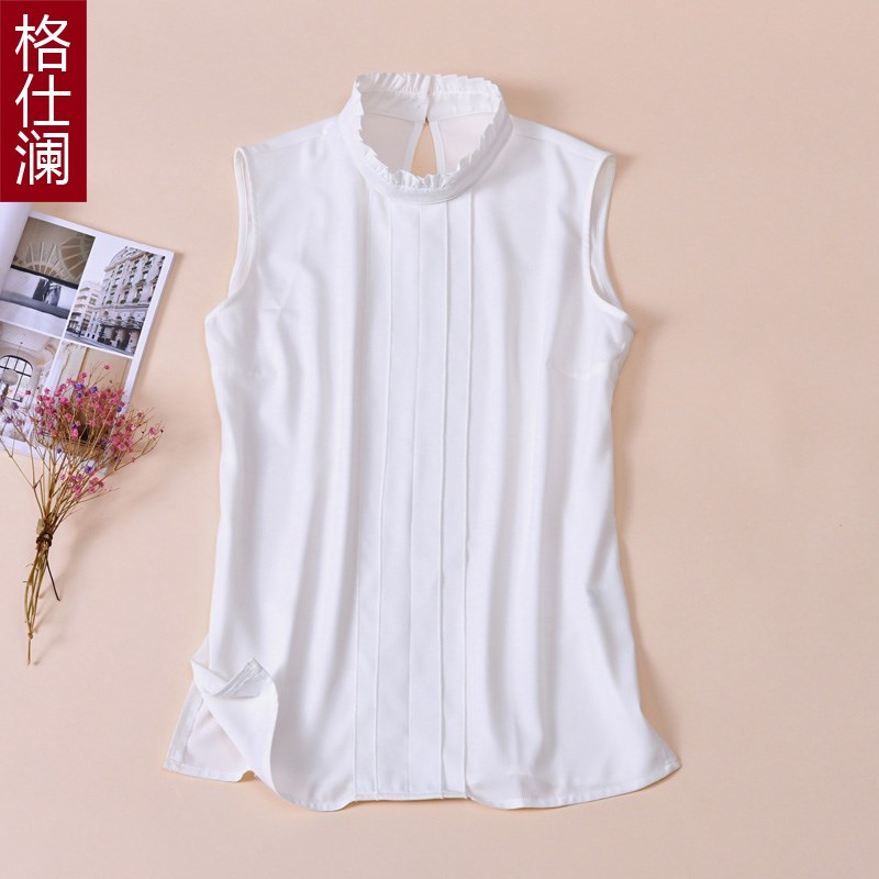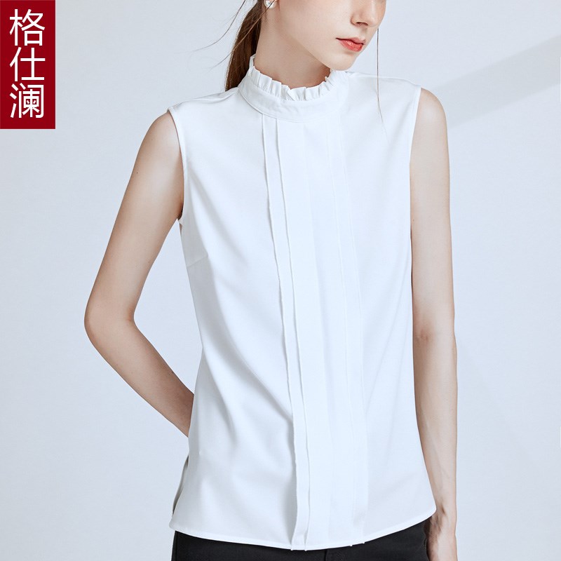 格仕澜2021秋冬新款衬衫立领木耳边上衣白色无袖雪纺衫背心打底衫