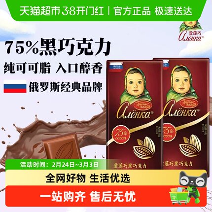 Alenka/爱莲巧75%黑巧克力纯可可脂大头娃娃俄罗斯进口糖果零食