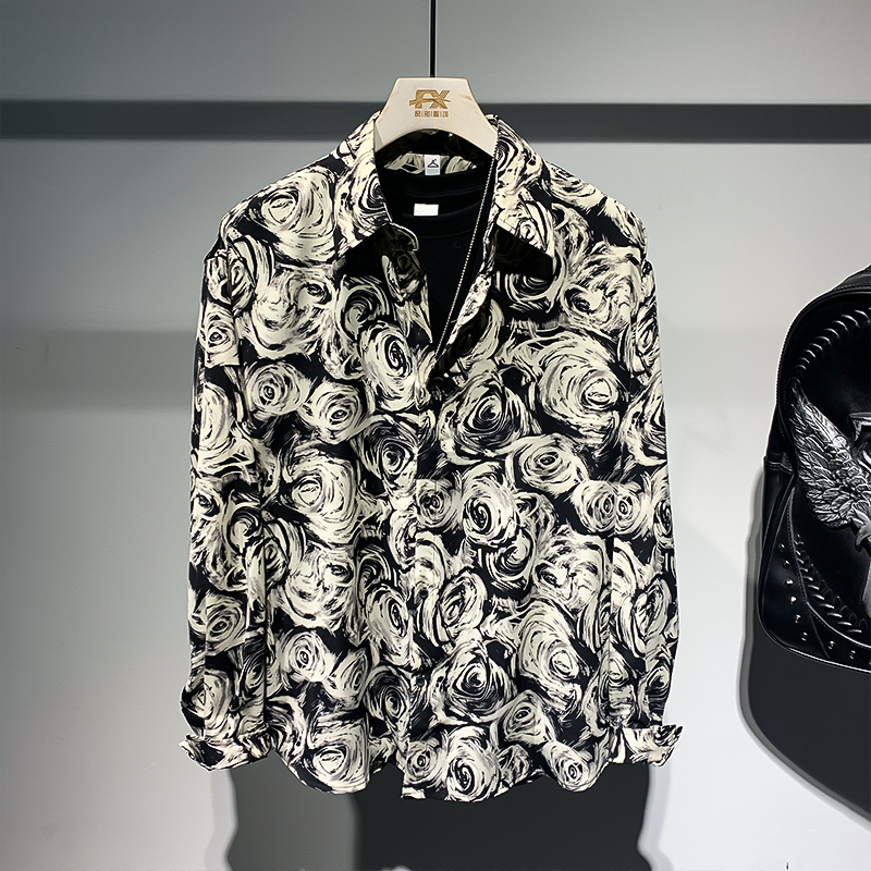 长袖花衬衫男士春秋新款炸街痞帅设计感宽松衬衣潮流百搭休闲寸衣