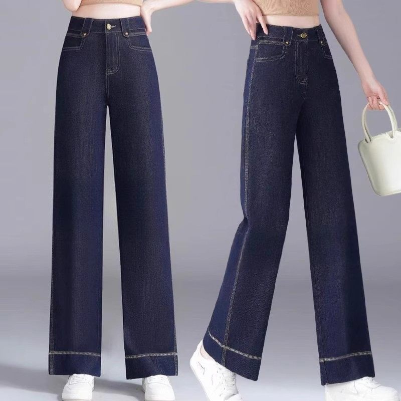 深蓝色天丝阔腿牛仔裤女夏季薄款2025新款松紧高腰宽松九分直筒裤