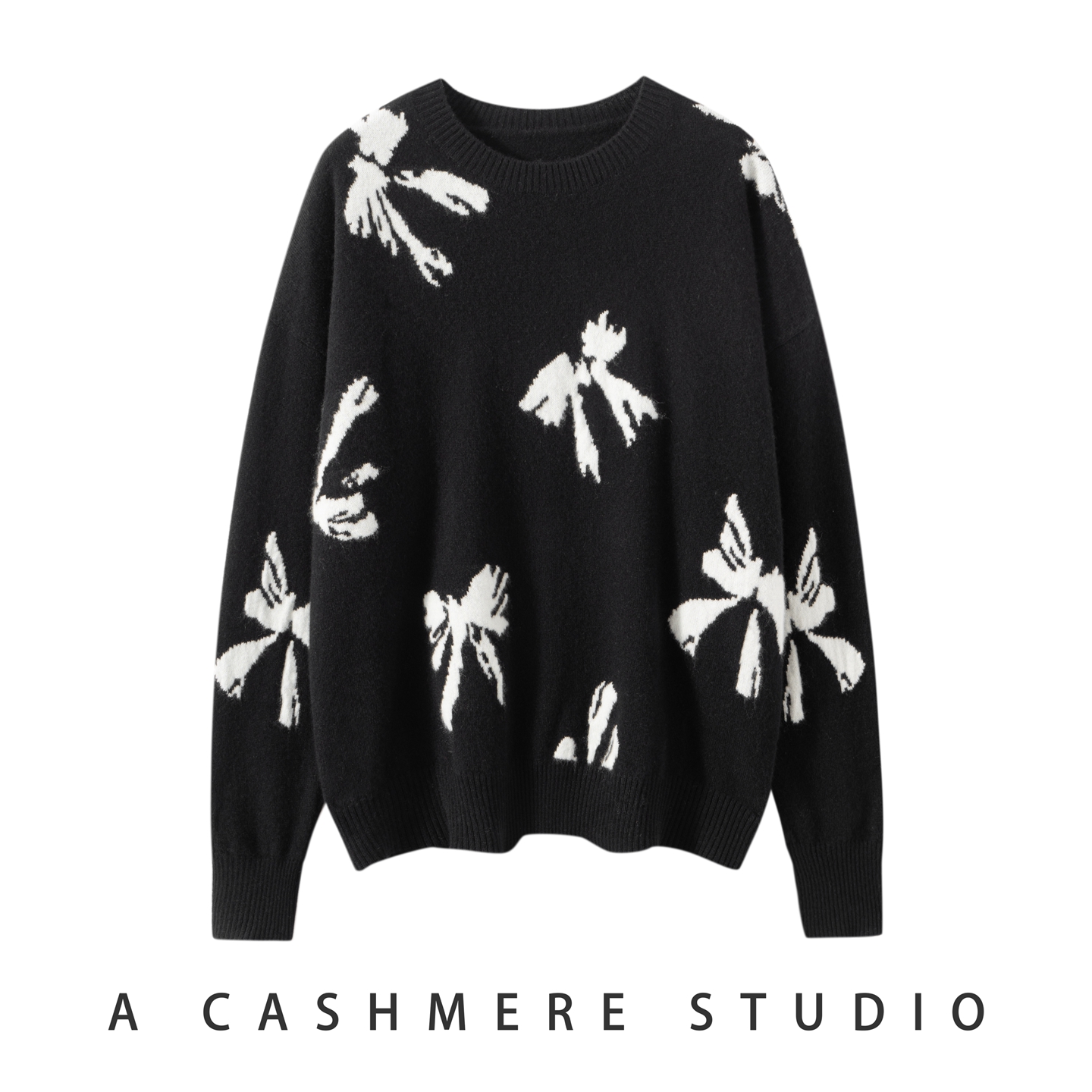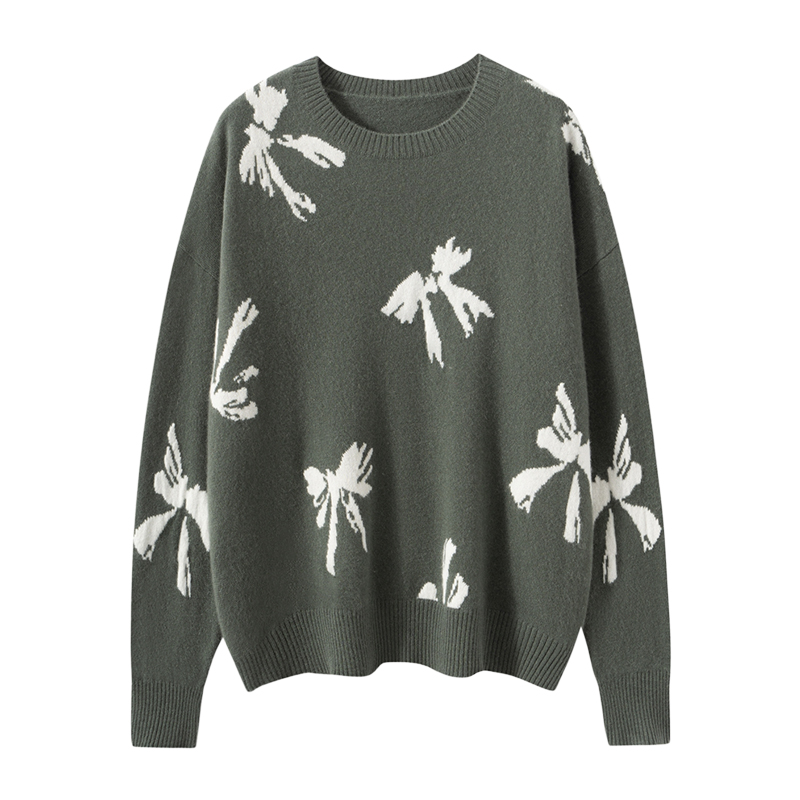 2025新款圆领大蝴蝶结提花100%山羊绒衫女针织保暖百搭毛衣打底衫