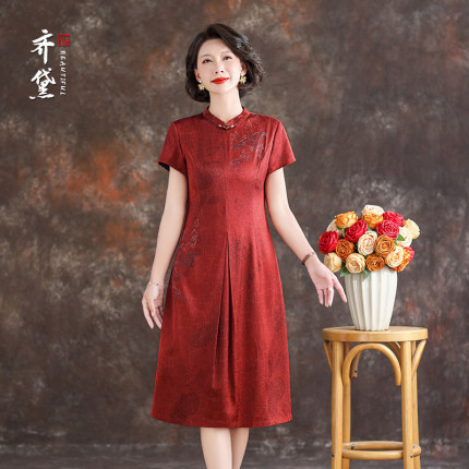 喜婆婆婚宴装2025新款妈妈高端礼服红色香云纱旗袍奢华显瘦连衣裙